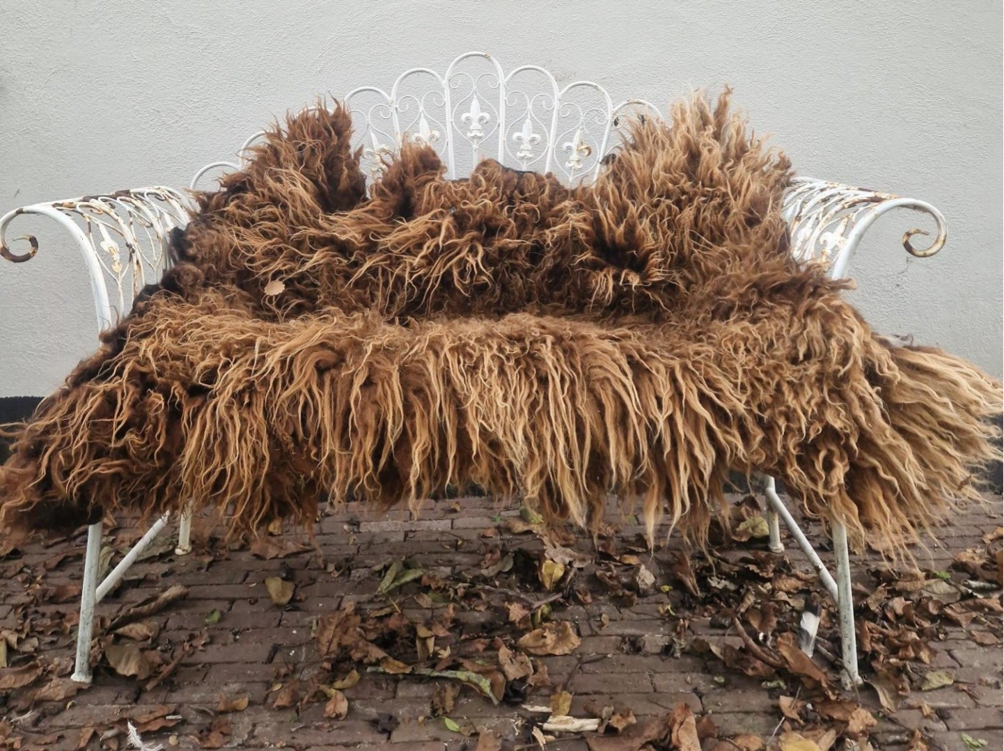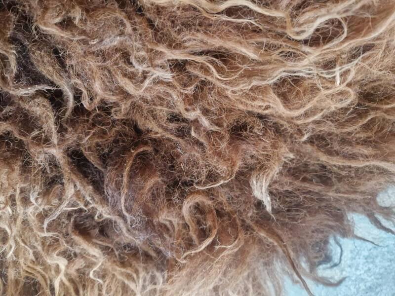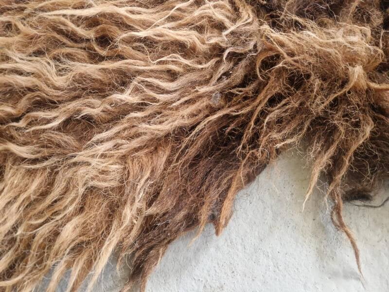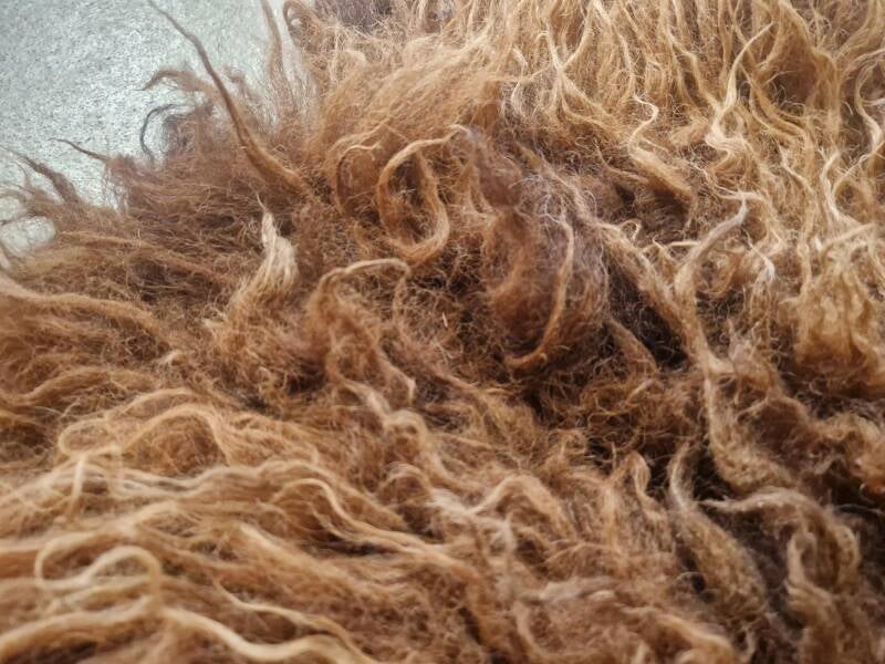 Dikke, volle vacht met grove lokken in warm chocoladebruin. Er zitten nog wat stukjes lokale flora in de vacht in het nekstuk, zie de foto met mijn hand.