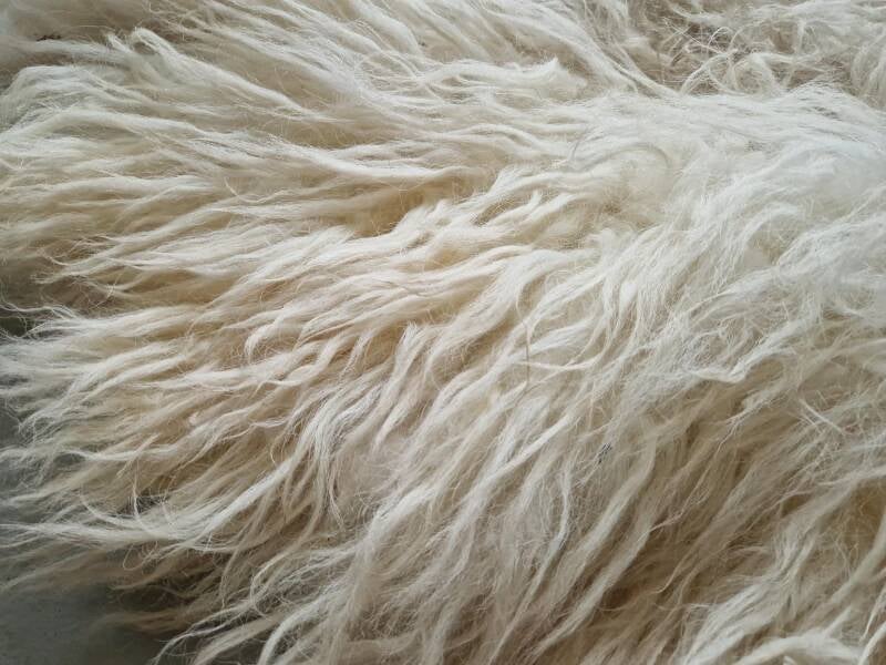 Soepele, wolwitte vacht. Vrij wit, bij de achterpoten en de oksels warmer.