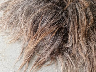 Erg lange lokken, grijs in de basis en uitlopend naar bruinig. Het vachtje zal nog haren en is daarom voornamelijk ter decoratie geschikt. Vachtjes #906, #907 en #908 zijn gemaakt van wol van hetzelfde schaap, een Drents Heideschaap uit Overijssel dat woont bij een zeer enthousiaste hobbyhouder. Hij is helemaal lyrisch van dit ras.