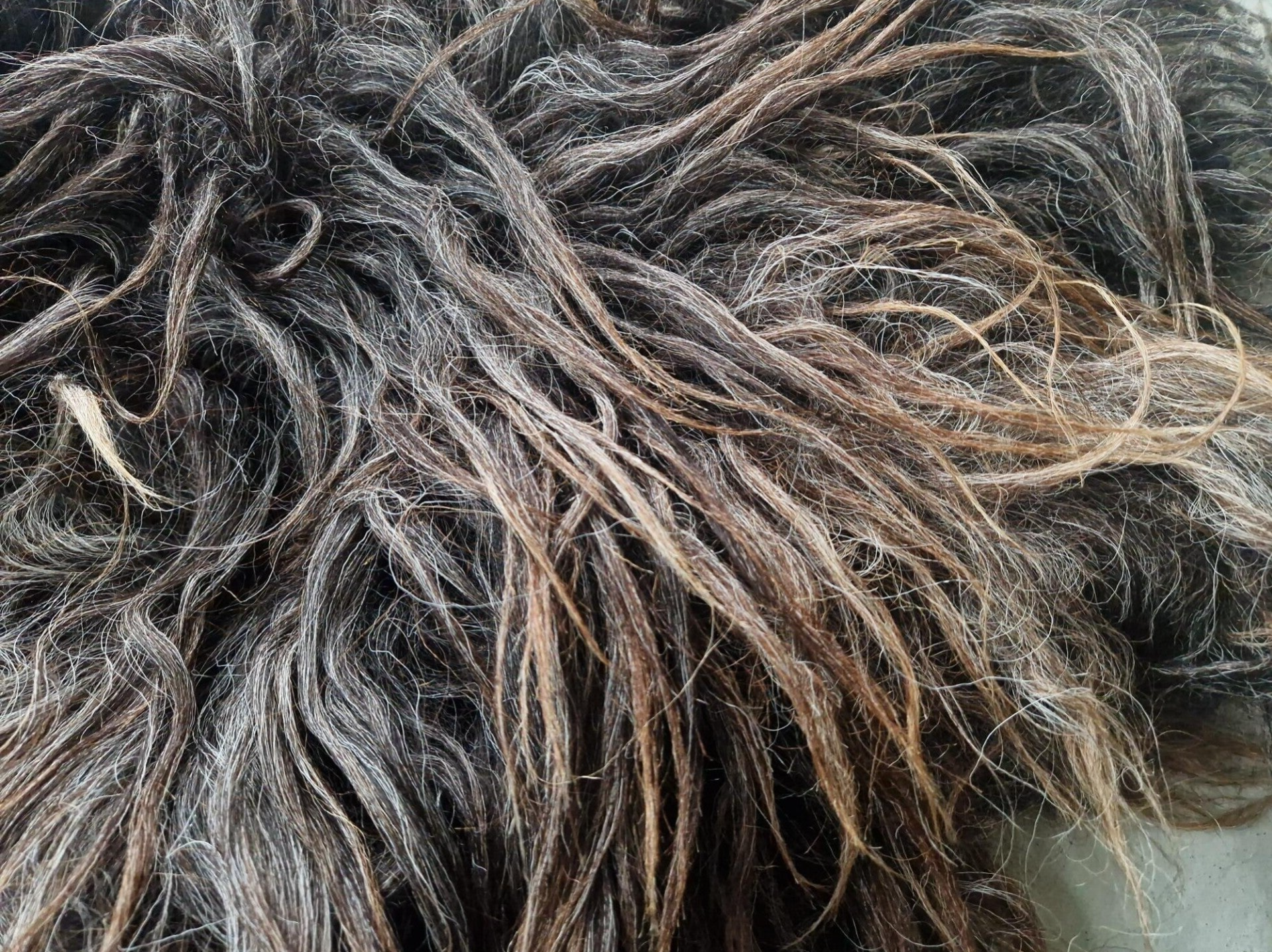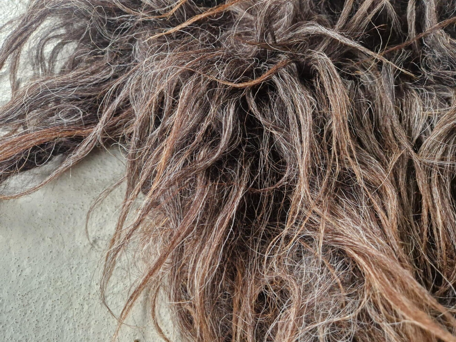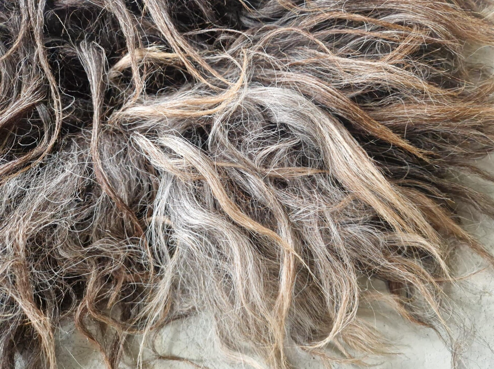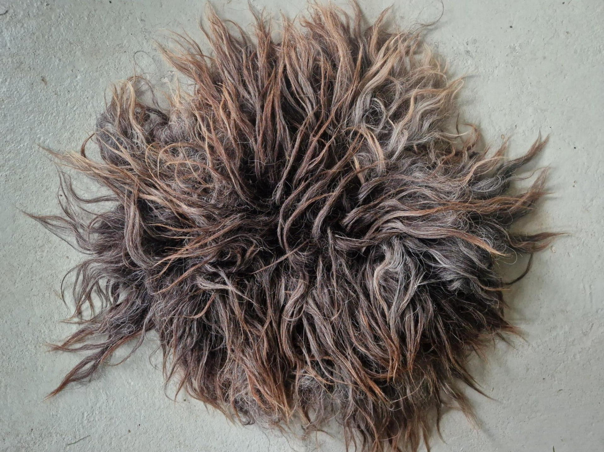 Erg lange lokken, grijs in de basis en uitlopend naar bruinig. Het vachtje zal nog haren en is daarom voornamelijk ter decoratie geschikt. Vachtjes #905, #906 en #908 zijn gemaakt van wol van hetzelfde schaap, een Drents Heideschaap uit Overijssel dat woont bij een zeer enthousiaste hobbyhouder. Hij is helemaal lyrisch van dit ras.