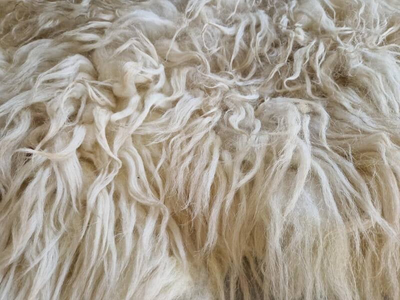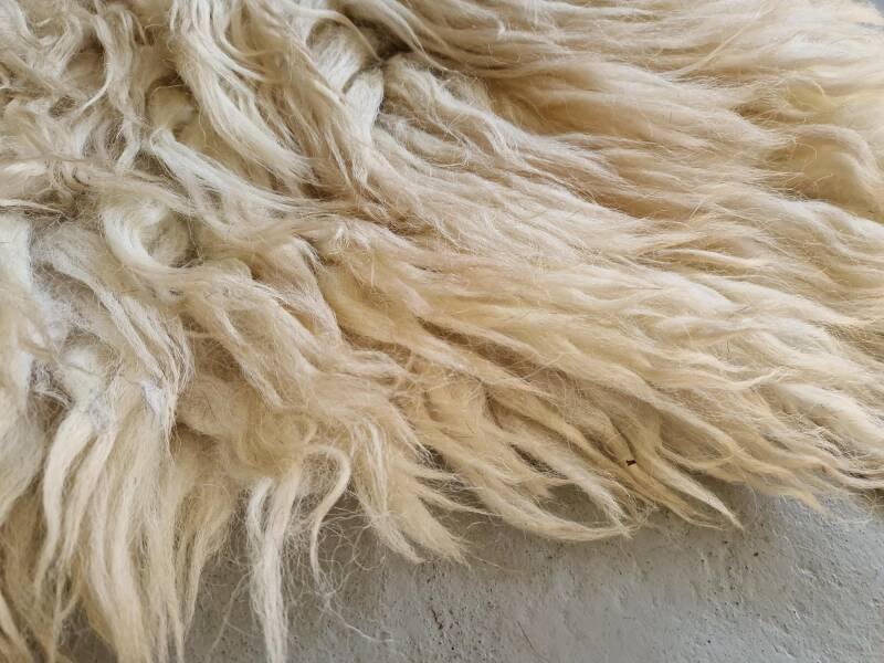Soepele, zachte, grote vacht met kortere tot halflange lokken. Wolwit met ietwat grauwig op het rugstuk en cremewit aan de zijkanten. Fijne vacht om in te zitten. Bij het nekstuk zit een stukje bruin/beige.