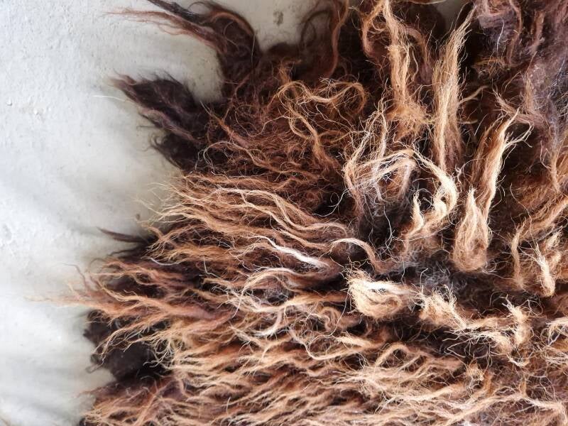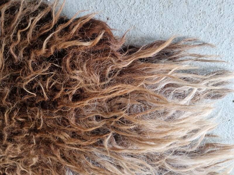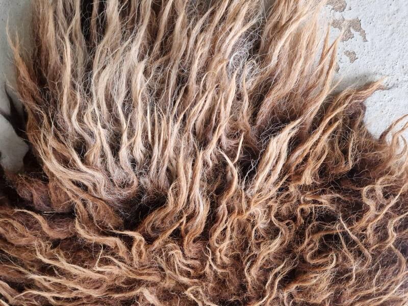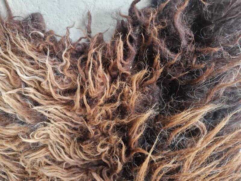 Soepele vacht, prachtig gelukt. Zwart in de basis, de lokken zijn bruin verlicht door de zon. De achterpoten hebben ook een paar blondere lokken. Op het nekstuk zijn de haren wat langer en zie je de donkere basis beter.