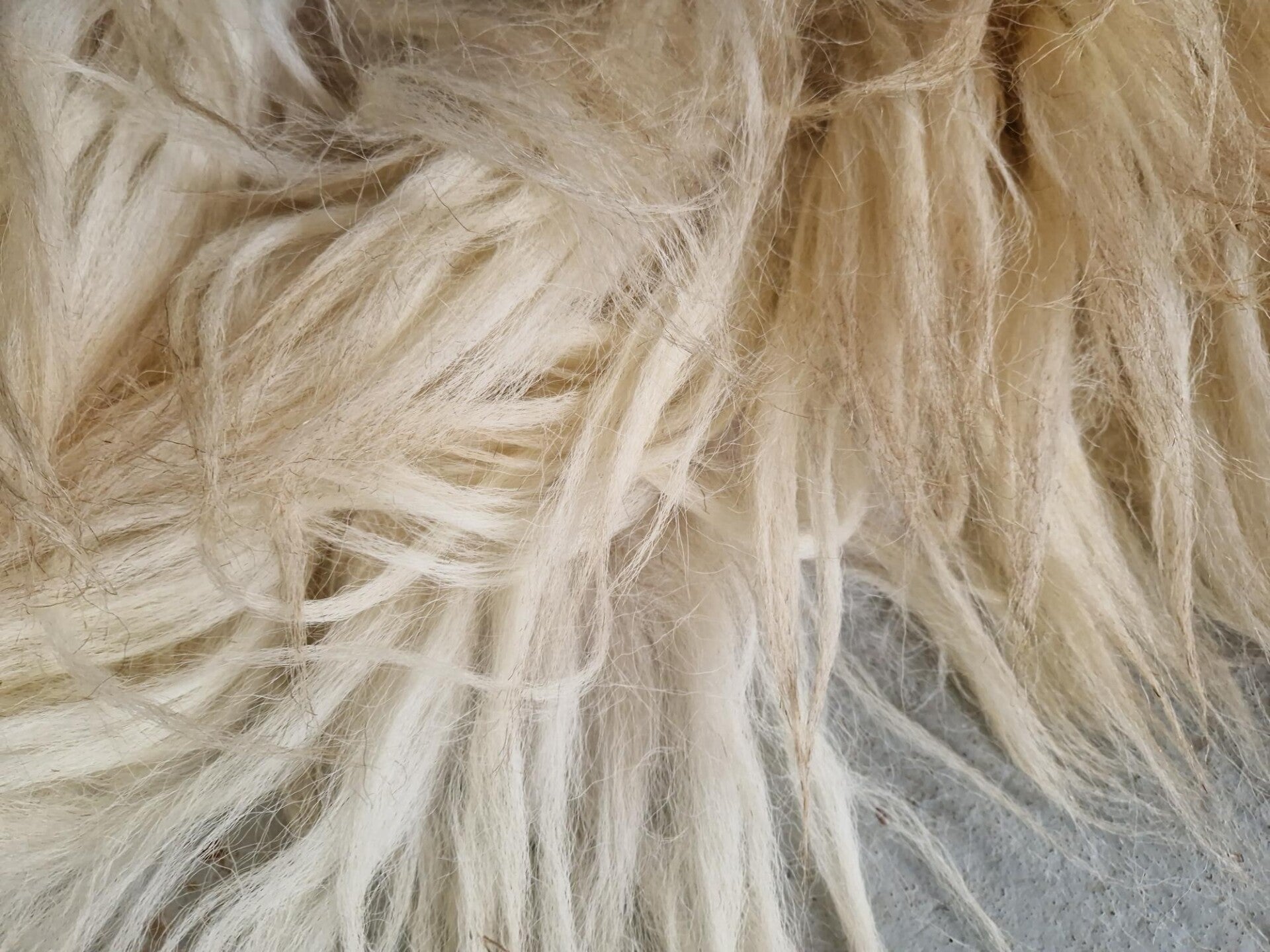 Enorm grote vacht met erg lange, dikke lokken. Wolwit, in het licht kleurt hij warmer wit. In de oksel iets geel (zie foto). Sommige lokken juist wat koeler, andere warmer. Het rugstuk is juist wat grauwer. Varërend van bijna ijswit tot geelwit dus. Enorme variatie.