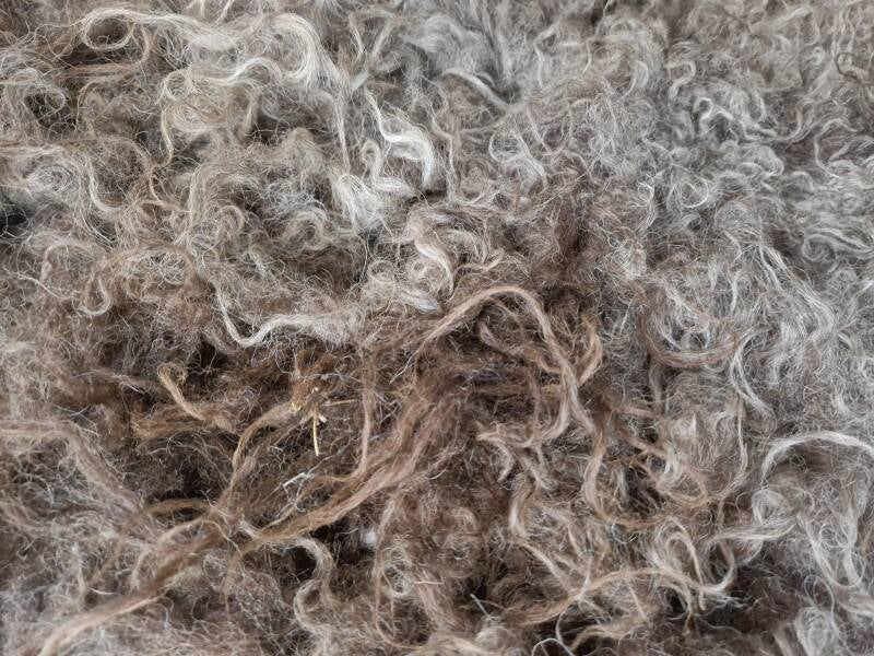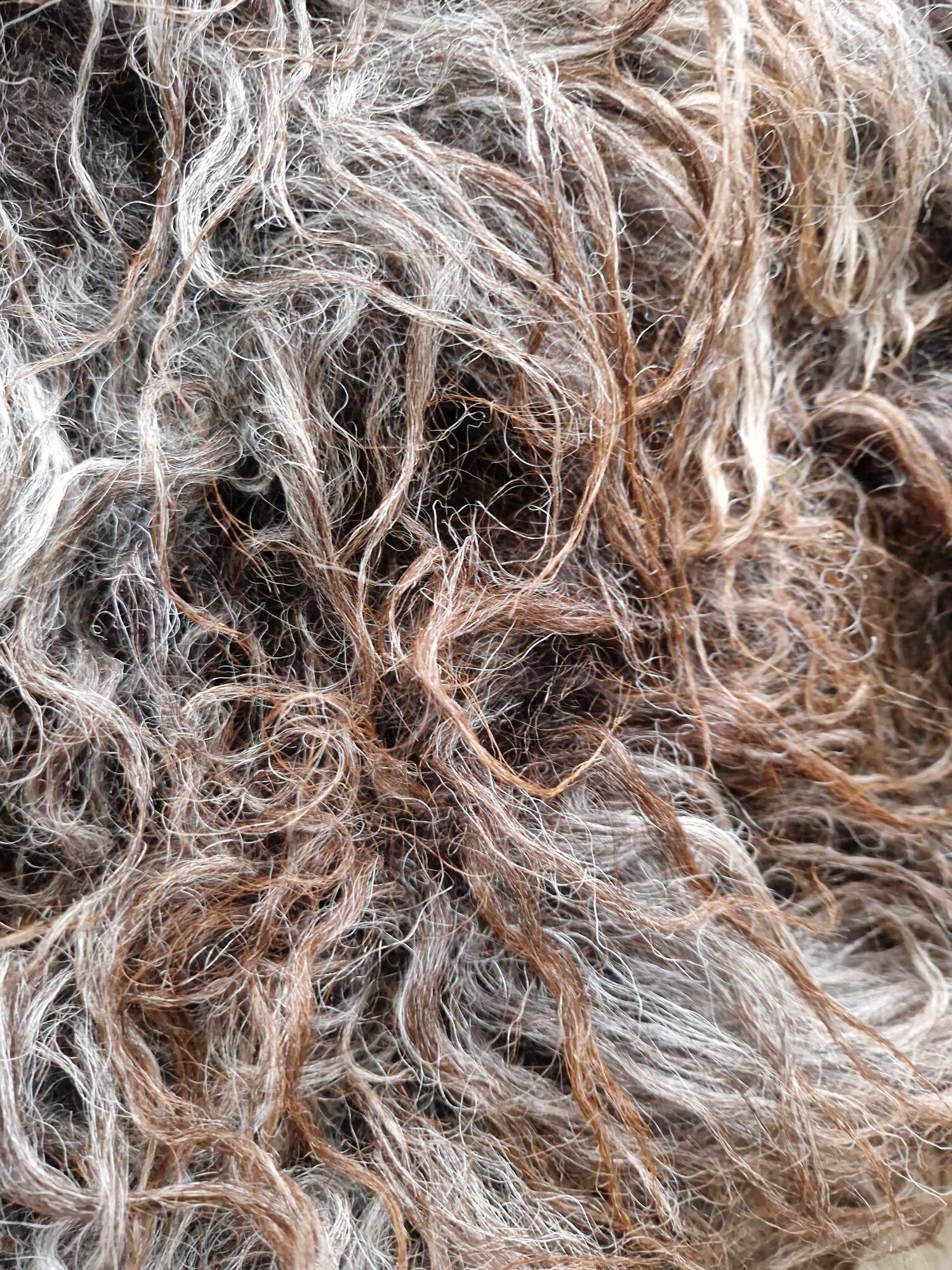 Soepele vacht, een deken bijna... Kortere tot halflange lokken in overwegend grijs, maar ook duidelijk bruine stukken. Ietwat rommelig/ruig ogend, niet glad, maar erg zacht. De lokken op de rug hebben her en der een lichte krul.