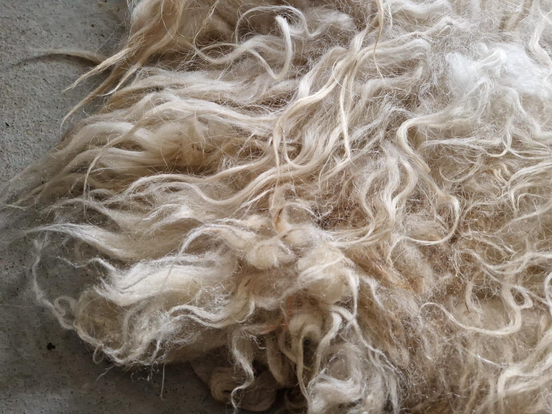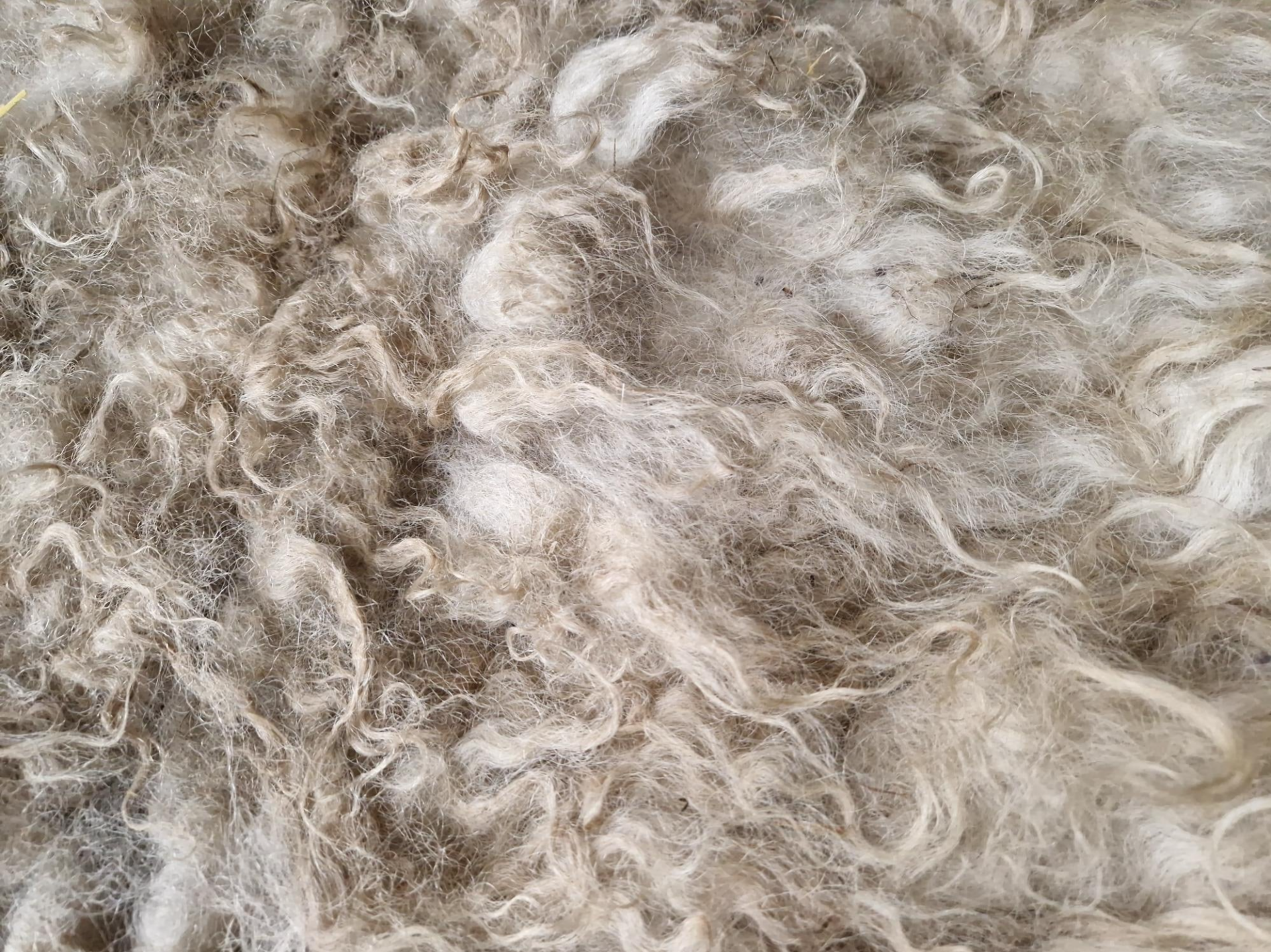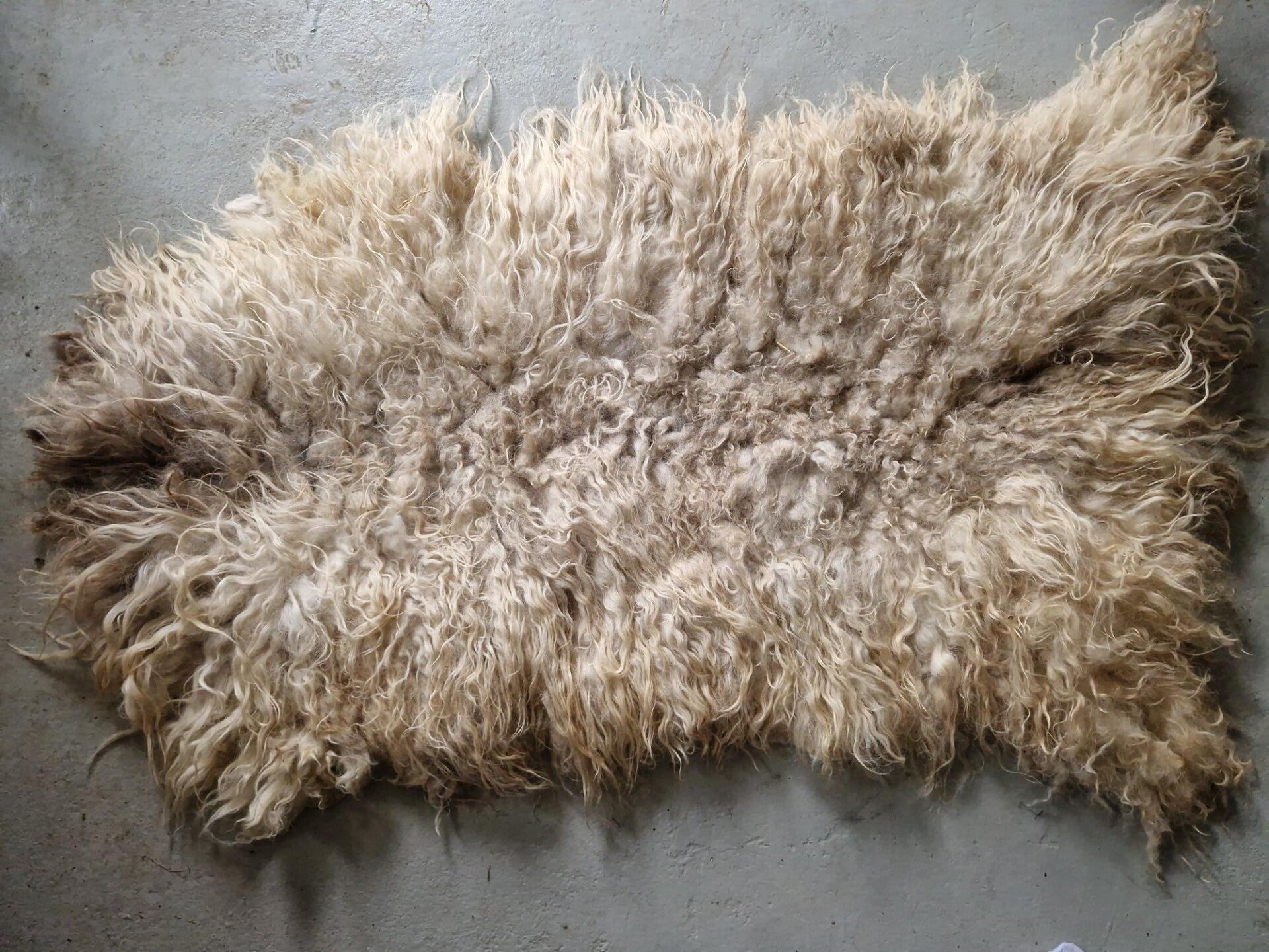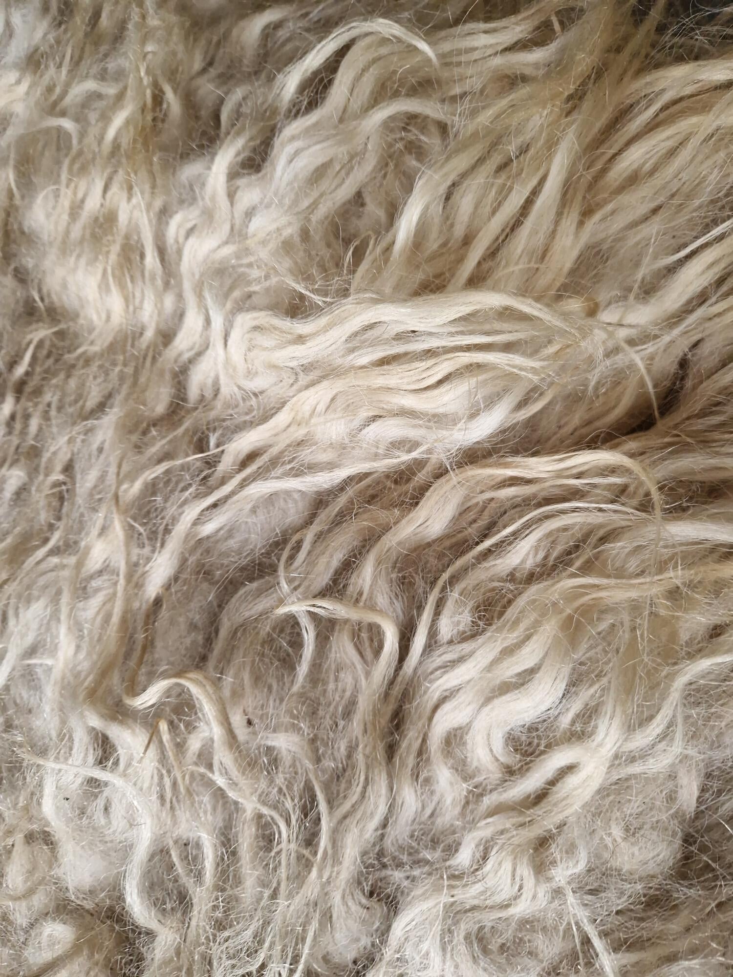 Grote, dikke en zware vacht met halflange tot lange lokken. Het rugstuk is wat korter. Overwegend wolwit, maar een tíkje kleur op de rug (wat grauwig). In de nek is het een stukje bruin.