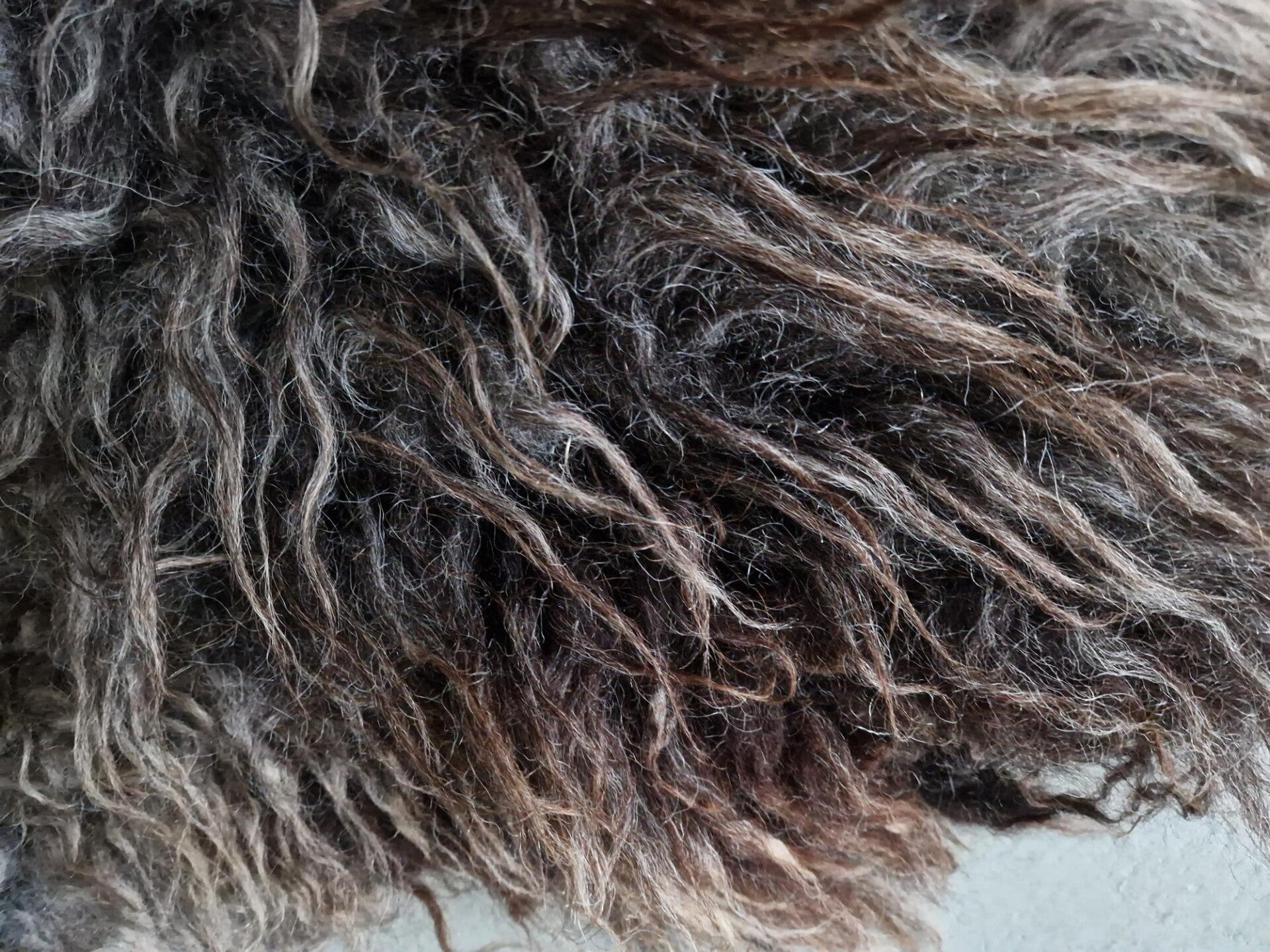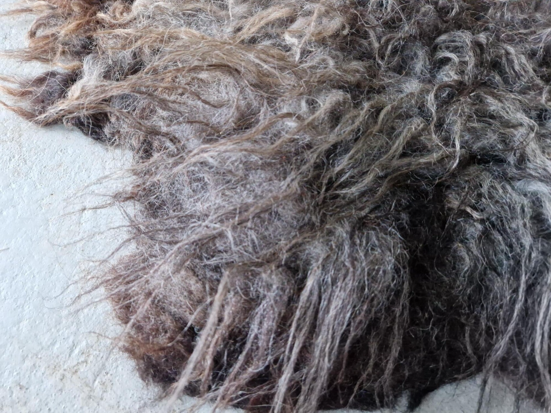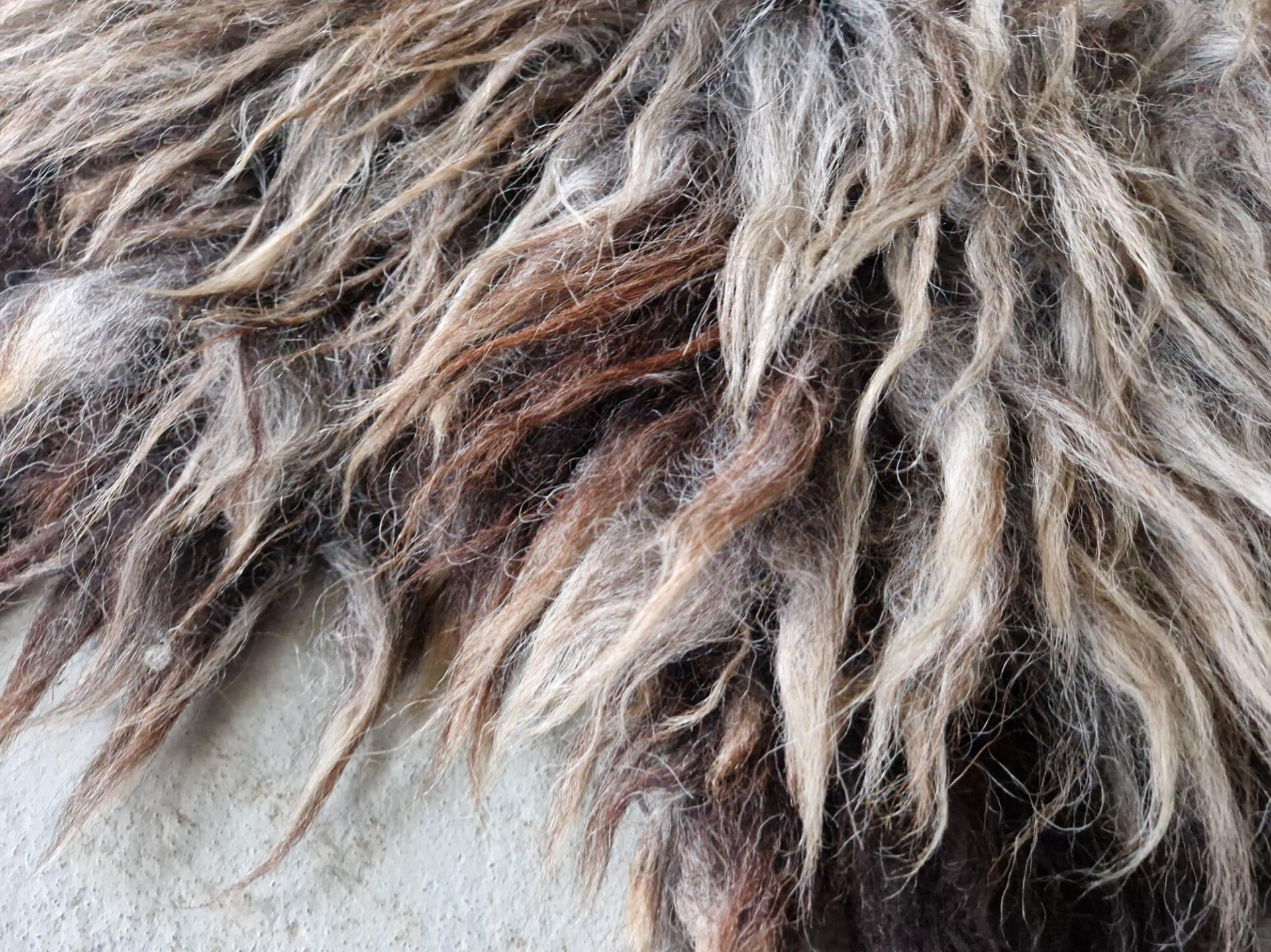Grijs gemêleerde vacht waarbij de lokken in de punten zijn opgelicht in bruin (dit gebeurt door de zon), waardoor de vacht mooi warm van kleur is. Halflange lokken, het rugstuk is wat korter en licht krullerig. Vrij zachte wol.