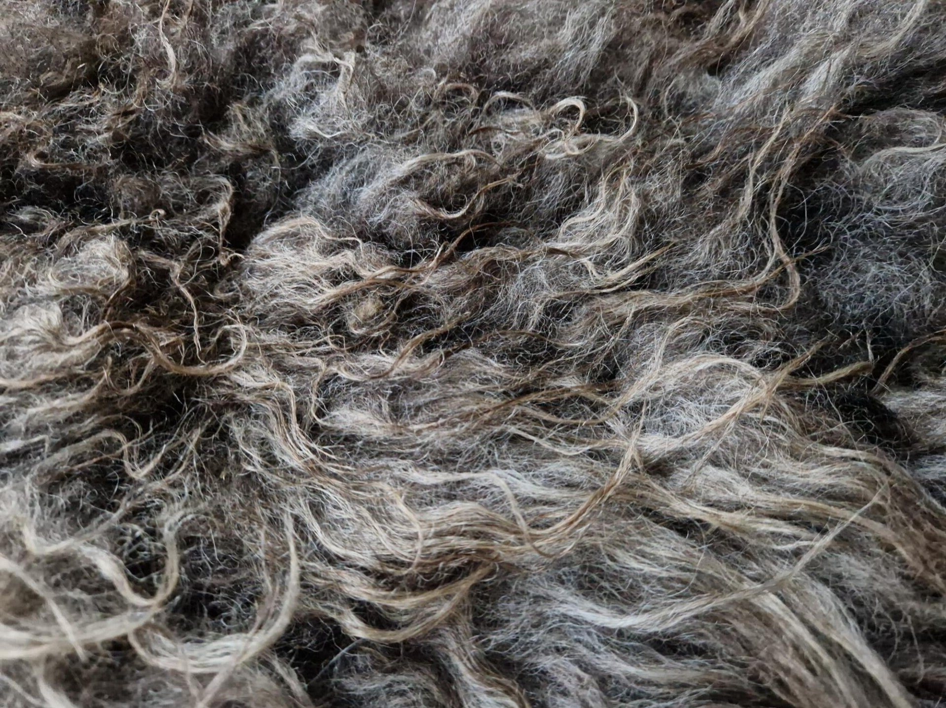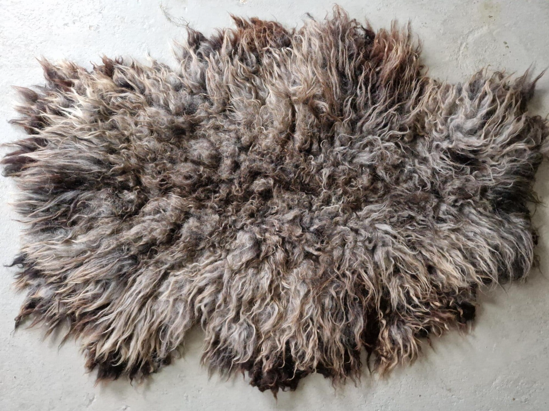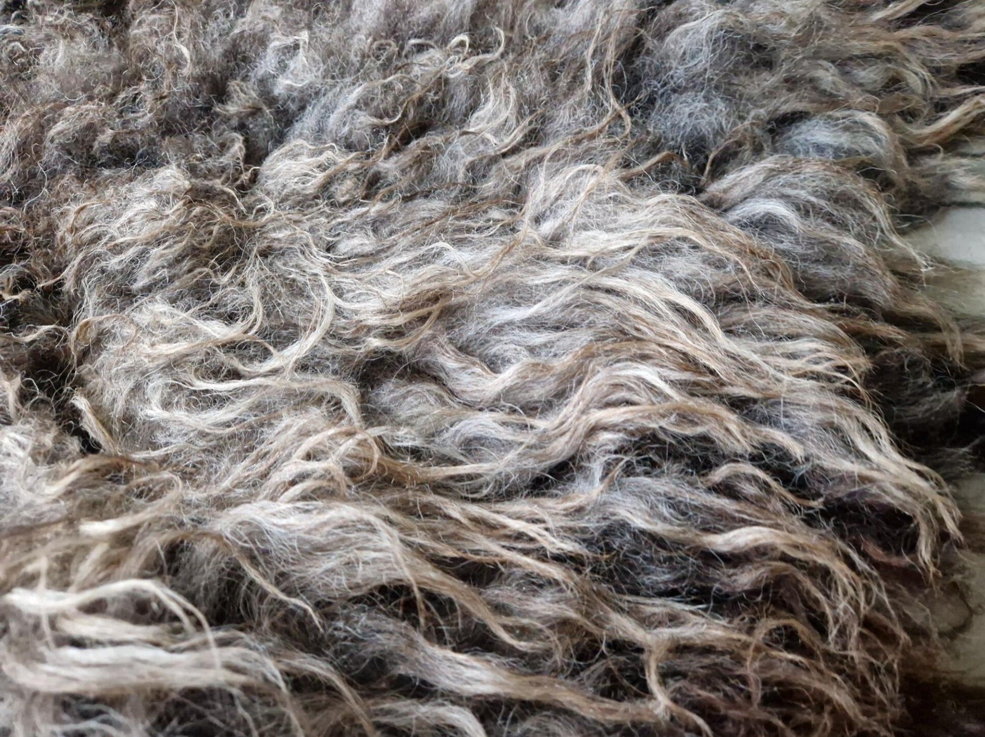Grijs gemêleerde vacht waarbij de lokken in de punten zijn opgelicht in bruin (dit gebeurt door de zon), waardoor de vacht mooi warm van kleur is. Halflange lokken, het rugstuk is wat korter en licht krullerig. Vrij zachte wol.