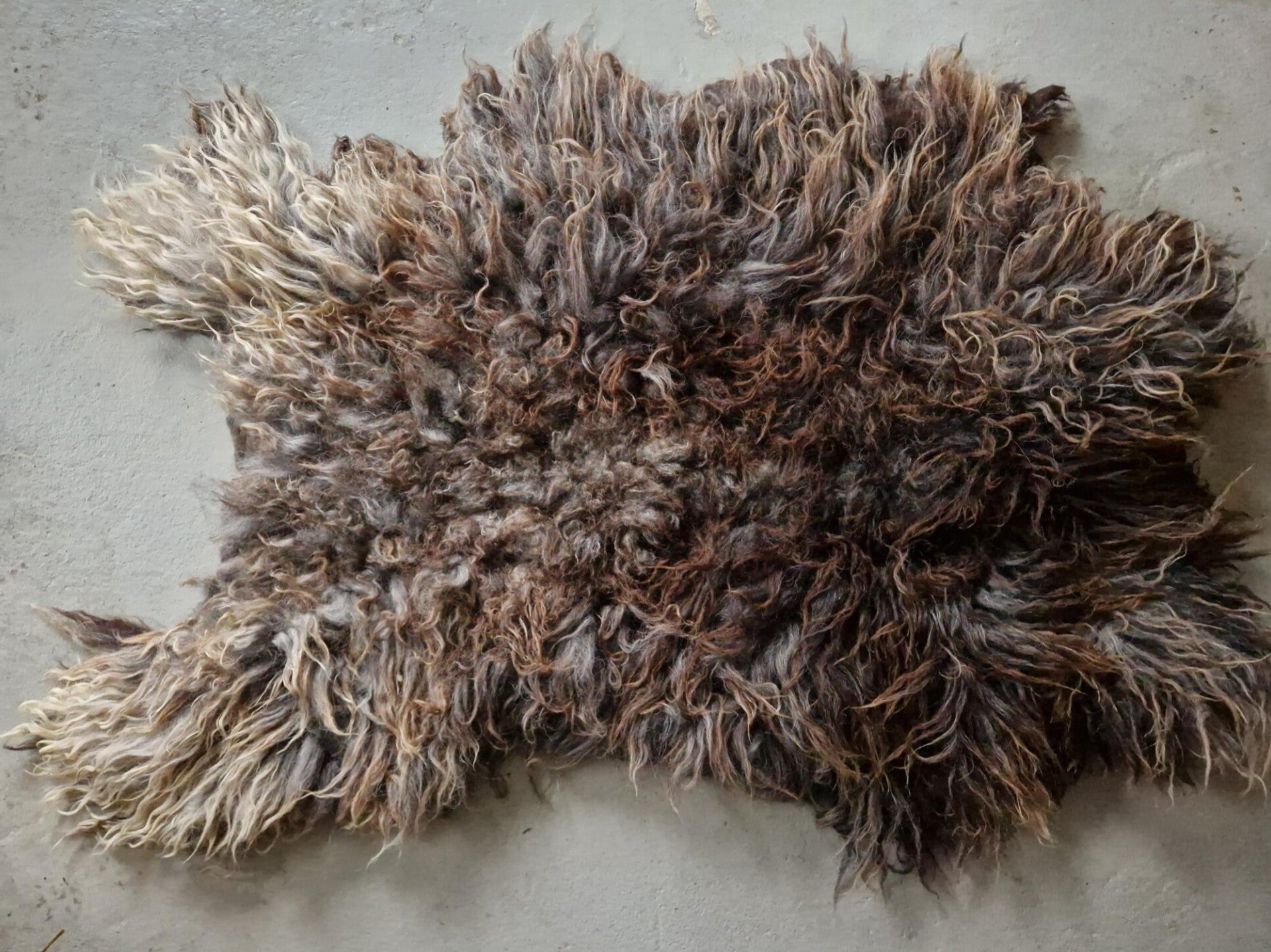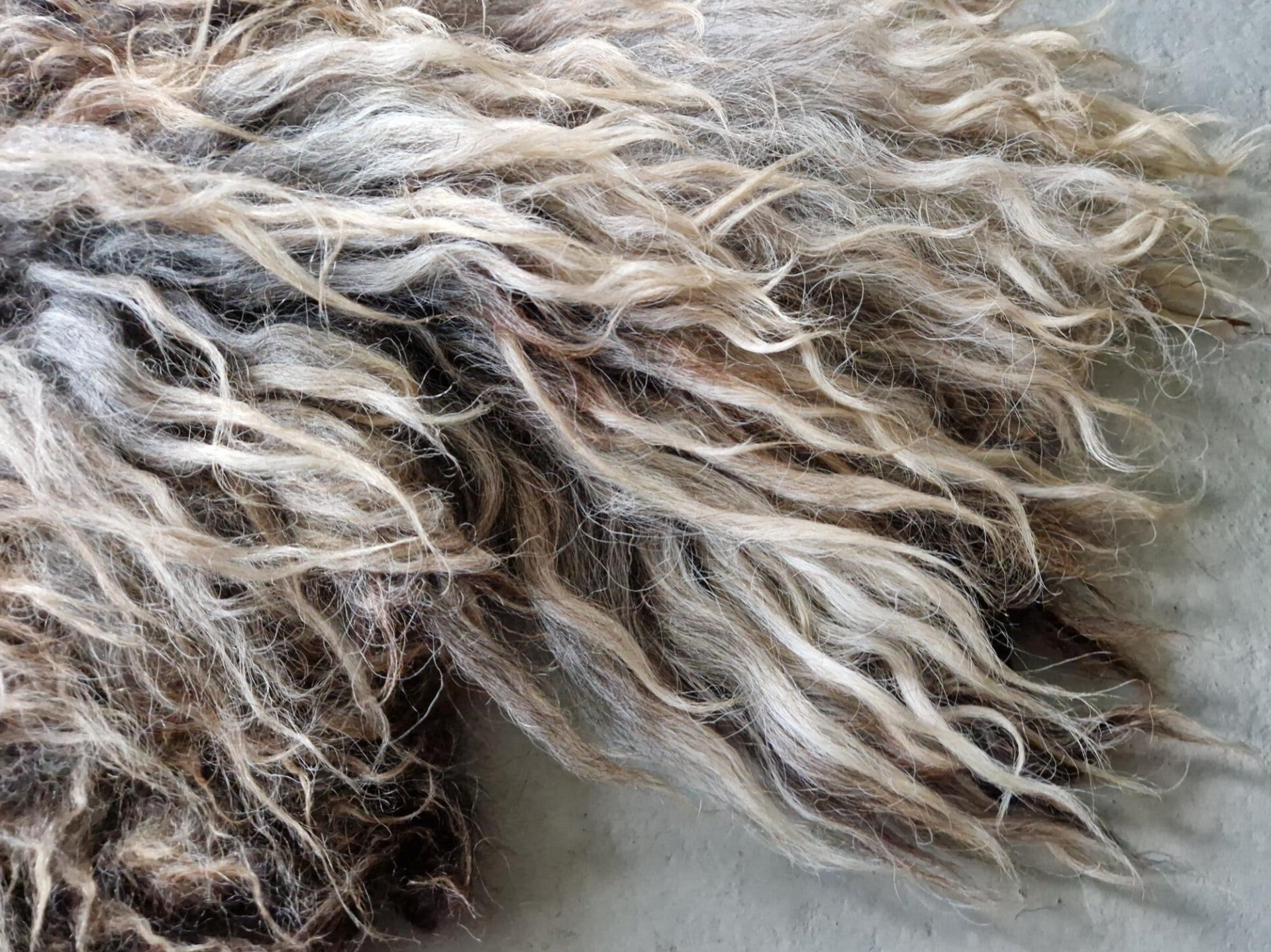 Dikke, stevige vacht. Groot. Grijs in de basis, de lokken lopen uit naar meer beige op de achterpoten, bruin in het midden en donker bij de schouders en in de nek. Prachtige gemêleerd.