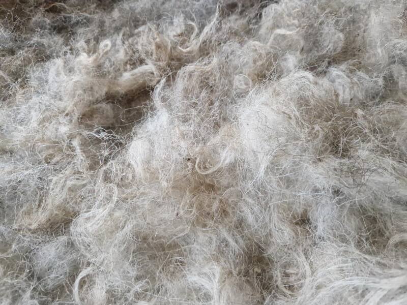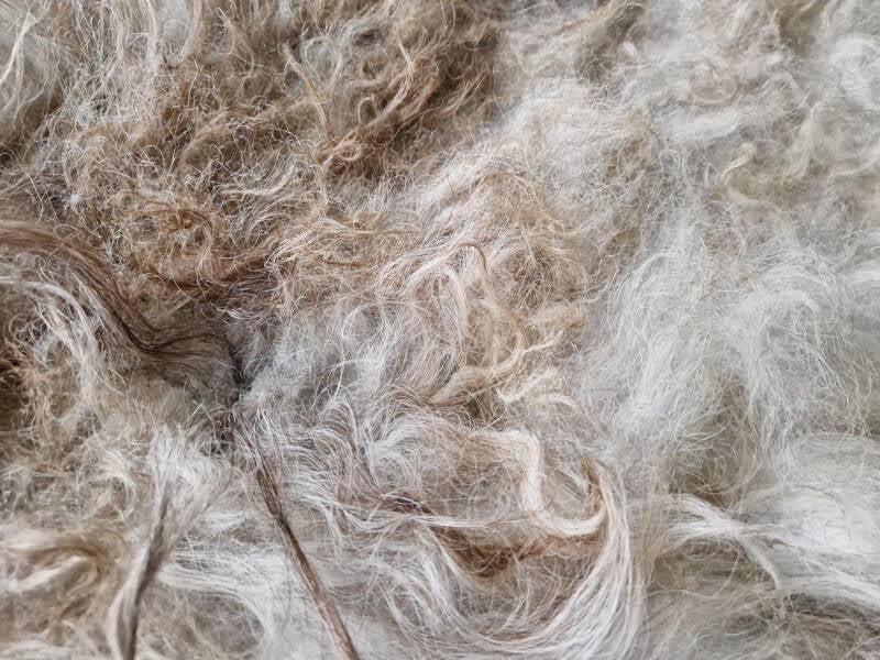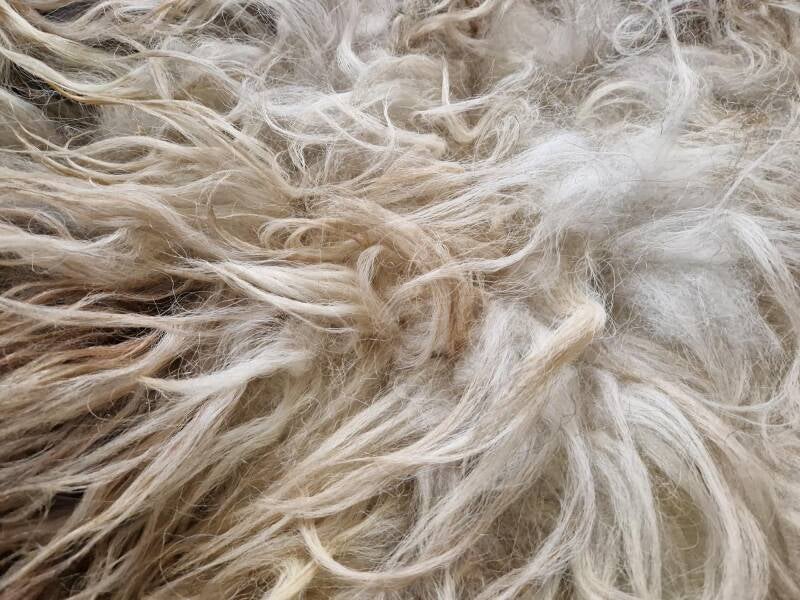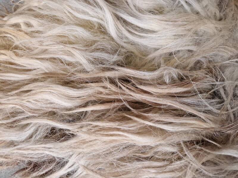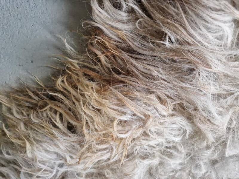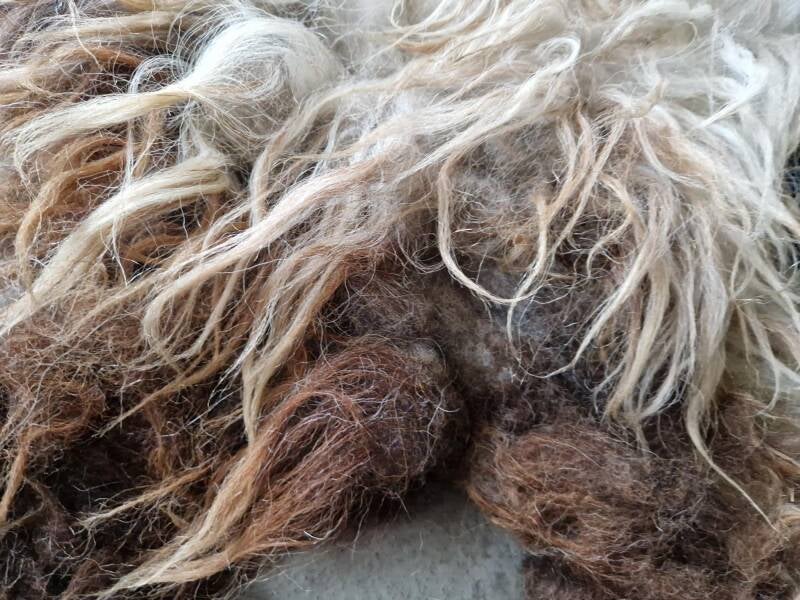 Zeer warm van kleur, deze grote vacht. Kleuren variëren van meer ijswit/grijswit tot bruin in de nek en voorpoten. De lokken zijn aan de flanken langer en dik, op het rugstuk zijn ze korter en wat pluiziger. Ze heeft een lammetje gehad dat graag op haar rug klimt.