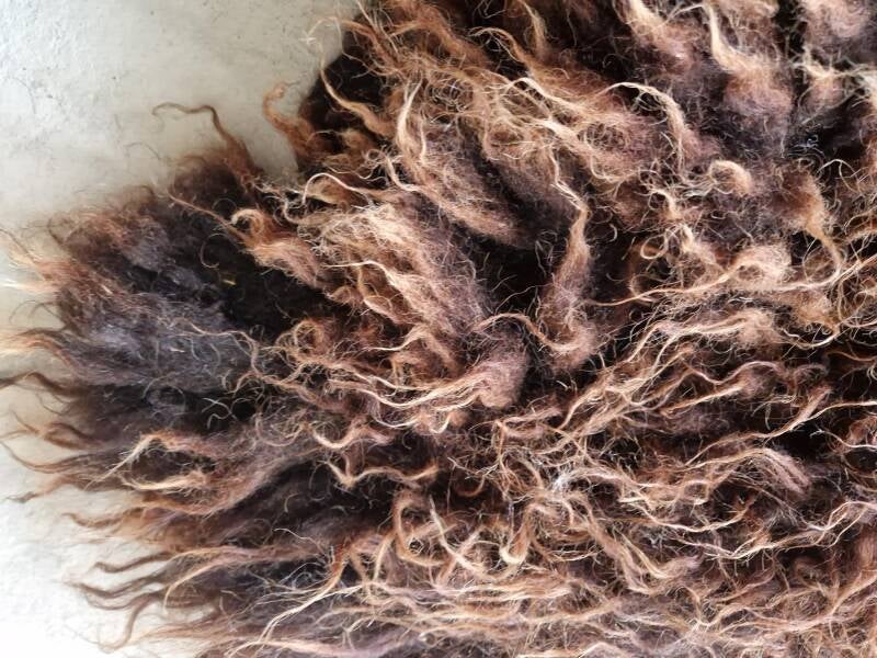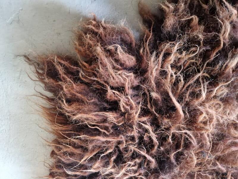Zachte vacht. Zwart in de basis, de lokken zijn bruin (natuurlijke verkleuring door de zon). Er zitten nog wat hooitjes in de vacht, maar dat is verder totaal niet storend.