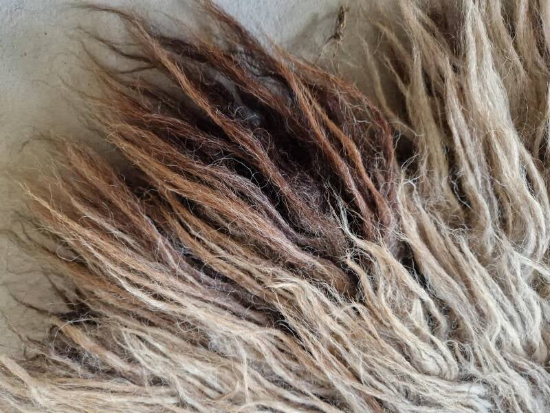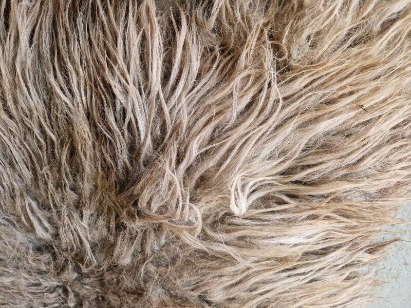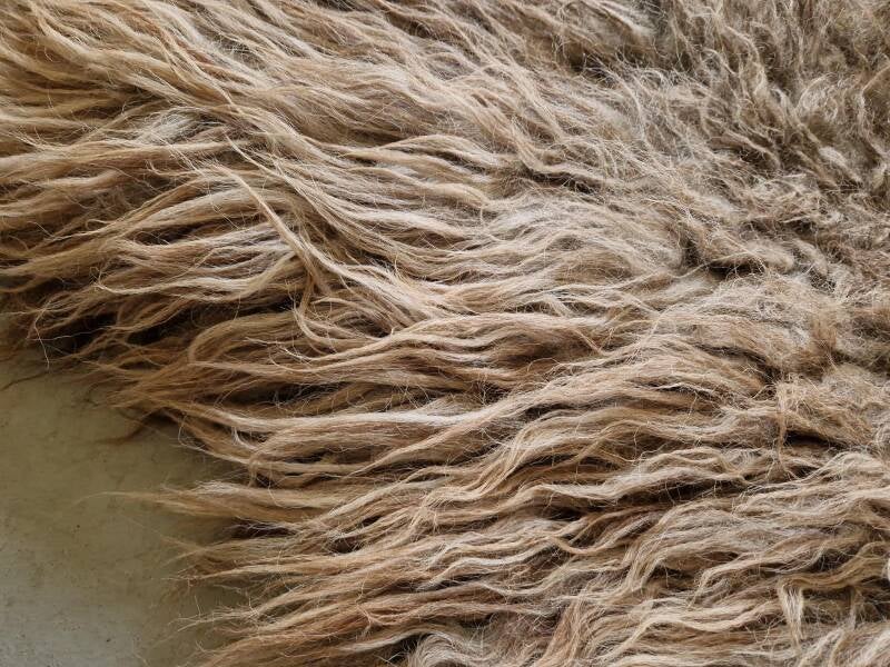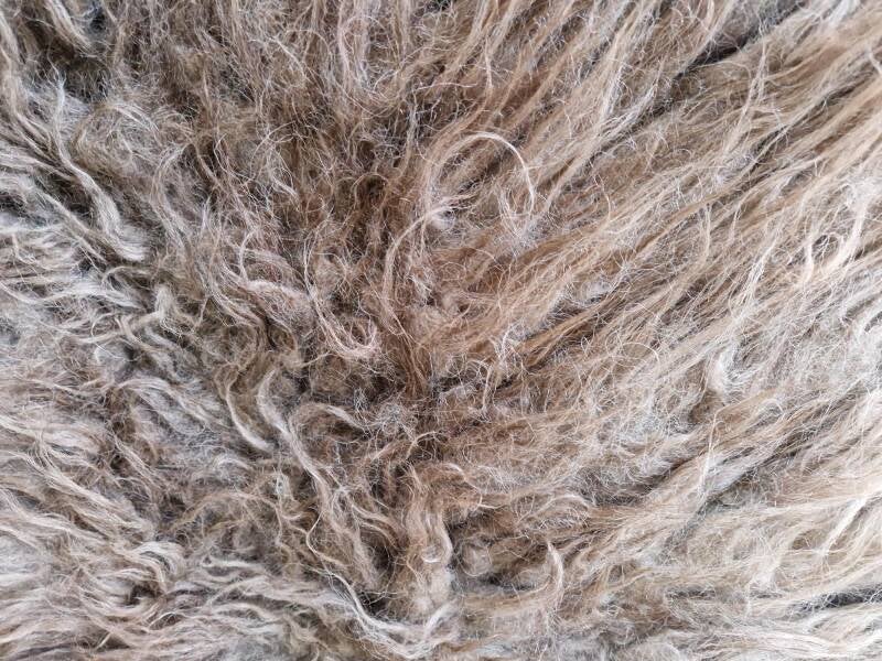 Grote, dikke vacht met grove, ruige lokken. Taupe en grijs in de nek en begin van het rugstuk, meer beige en bruin aan de flanken. Stevig en dik gevilt.