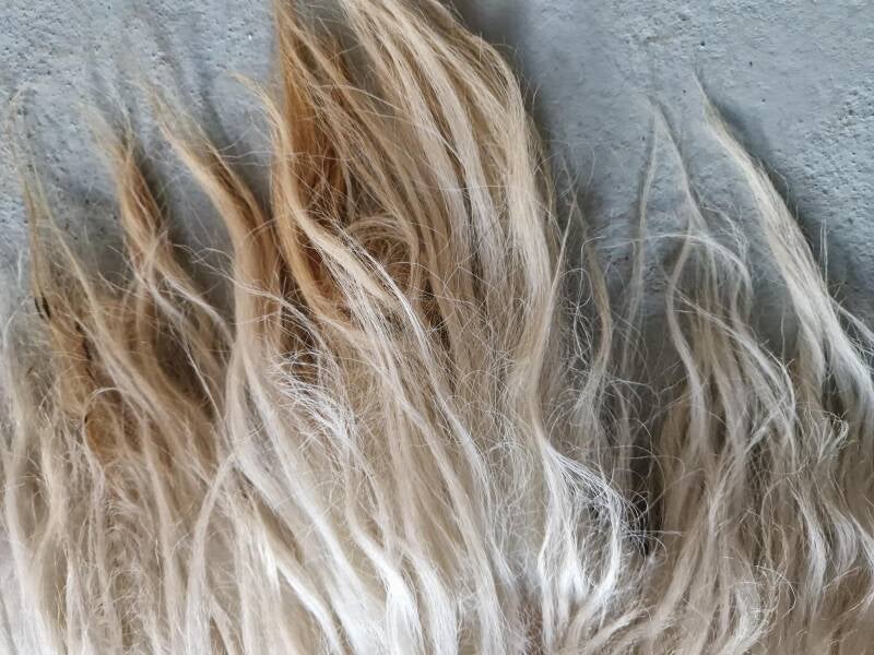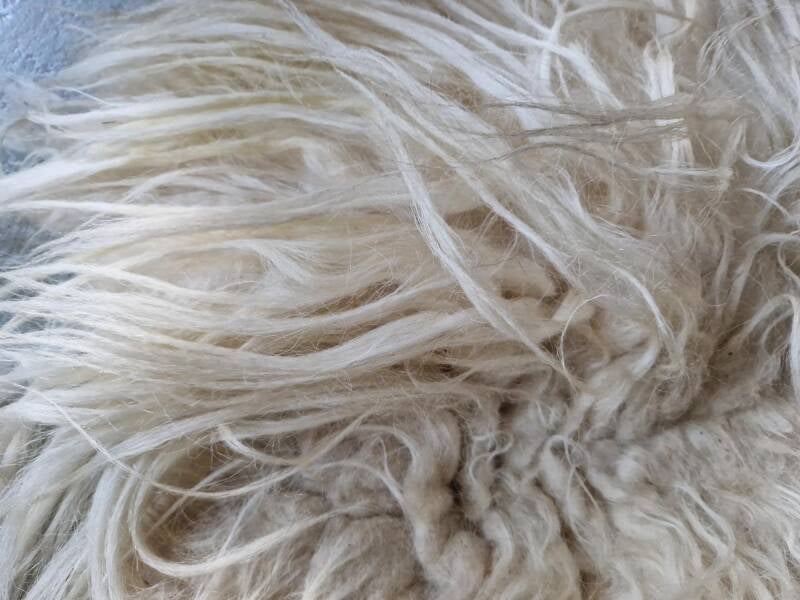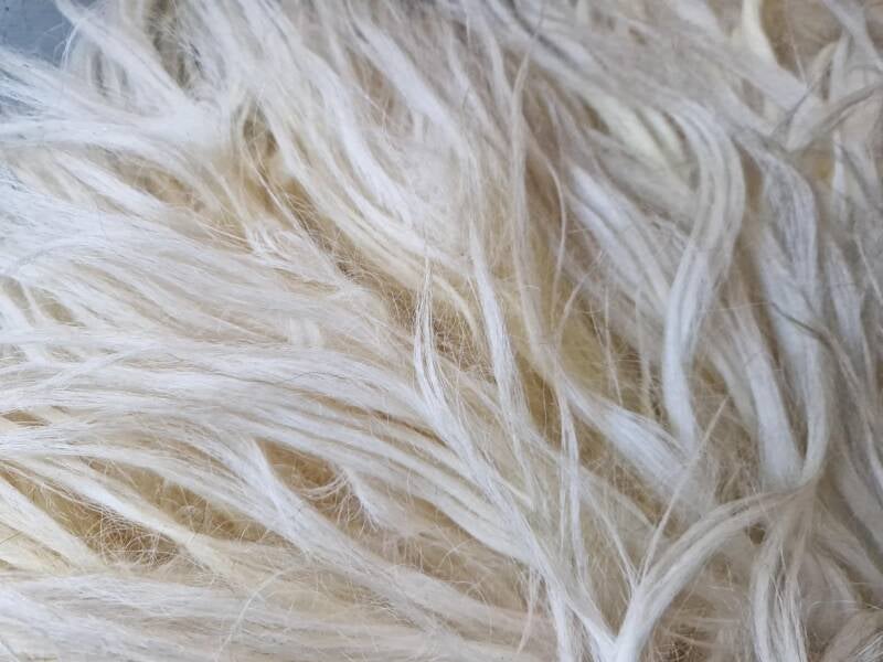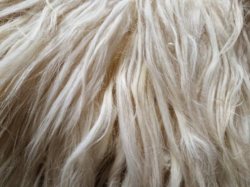 Dikke, lange lokken overal, in wolwit. Bij de oksels neigend naar wat gelig wol, zoals vaak bij witte vachten. Dit is de natuurlijke kleur. Prachtig vallende vacht.