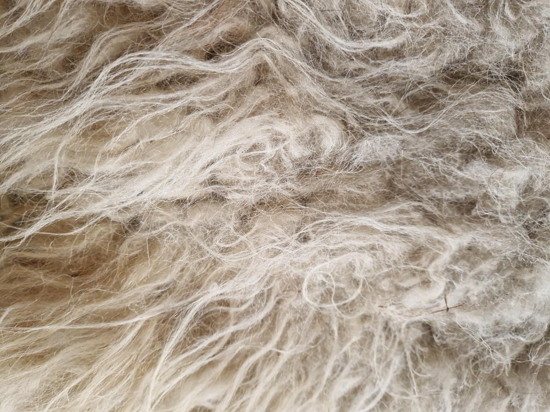 Stoere vacht met op de rug korte wol, de flanken zijn lang. Grijswit en voswit, maar ook lichter witte lokken ertussen.