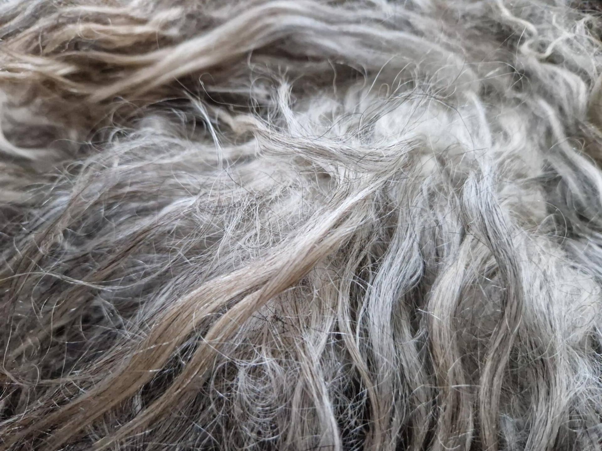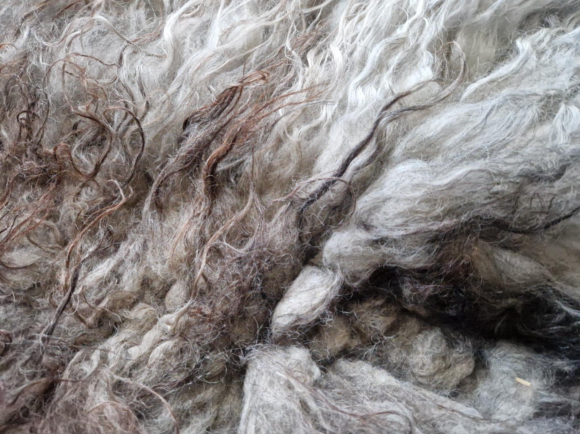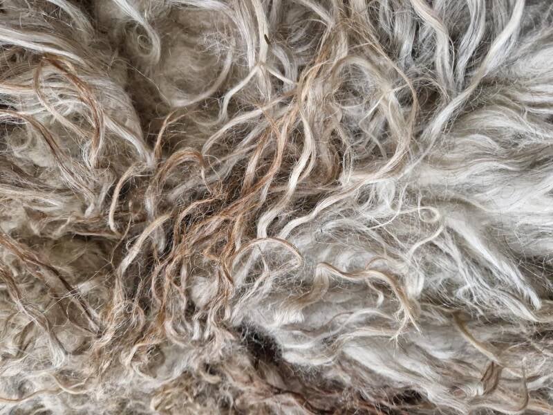 Vacht met wit, grijs, bruin/koper, crème. Voelt heerlijk zacht aan, fluweelachtig bijna. De lokken zijn lang met een lichte krul.
