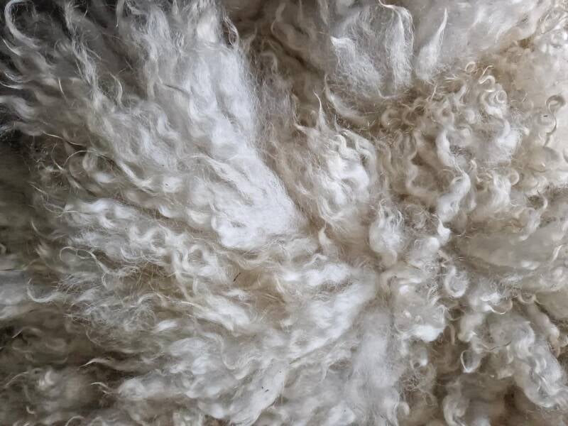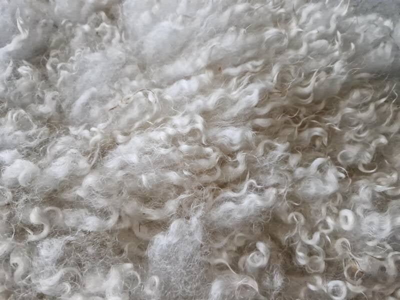Helder wolwitte kortere tot halflange lokken met lichte krul en een lichte glans. Super zacht aanvoelend. De wol komt van een kruising Swifter/Gotland schaap uit Gelderland. Gotland gaf de krul, Swifter de zachtheid...