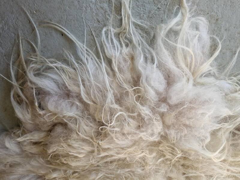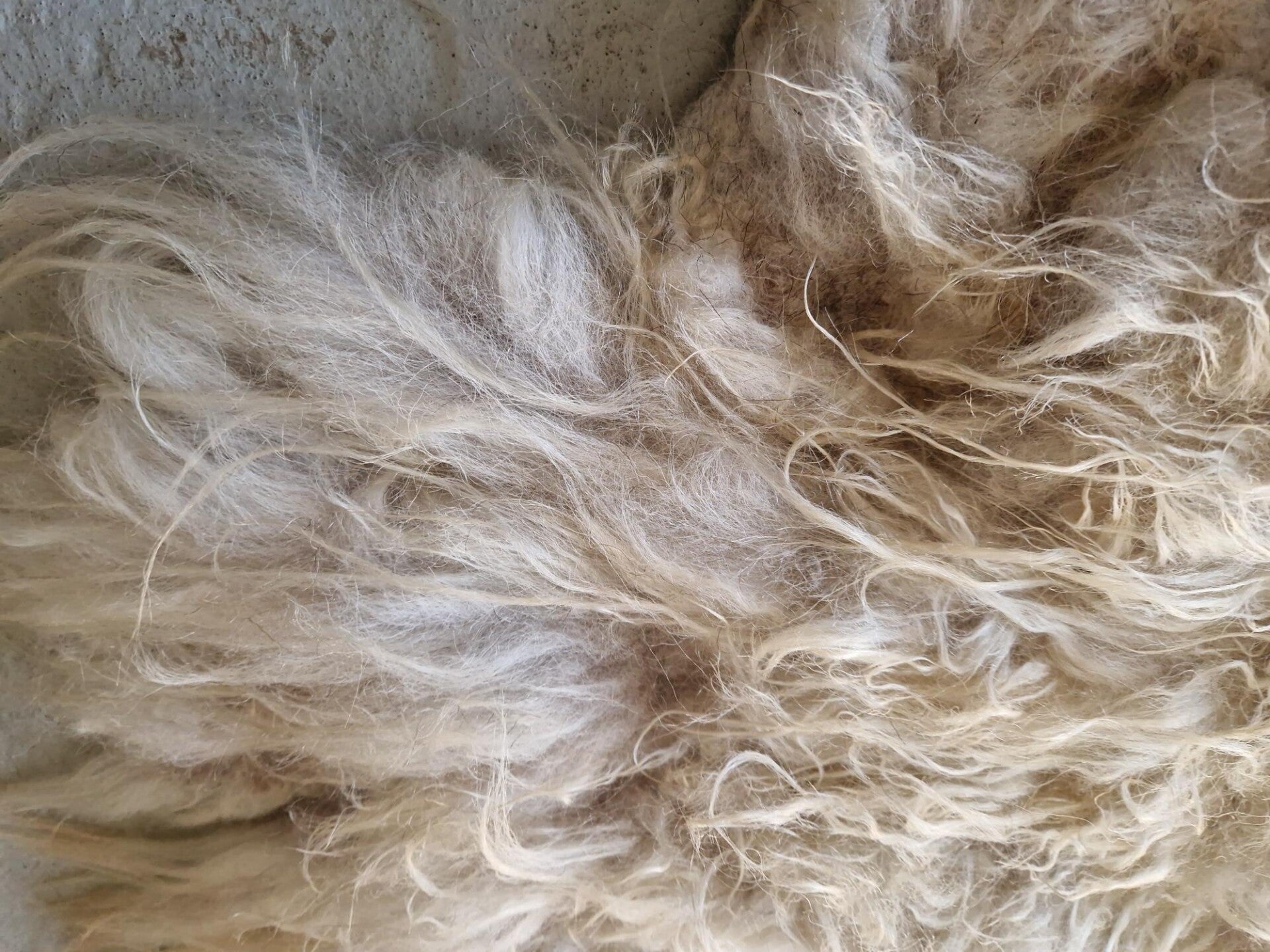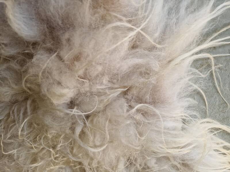 Zachte wol in wolwit, maar toch duidelijk wat vossigs in de basis. Vachtjes #954 en #955 zijn gemaakt van de wol van hetzelfde schaap, een Drents Heideschaap uit Flevoland. Op de foto met het witte bankje is het het vachtje dat op de zitting ligt.