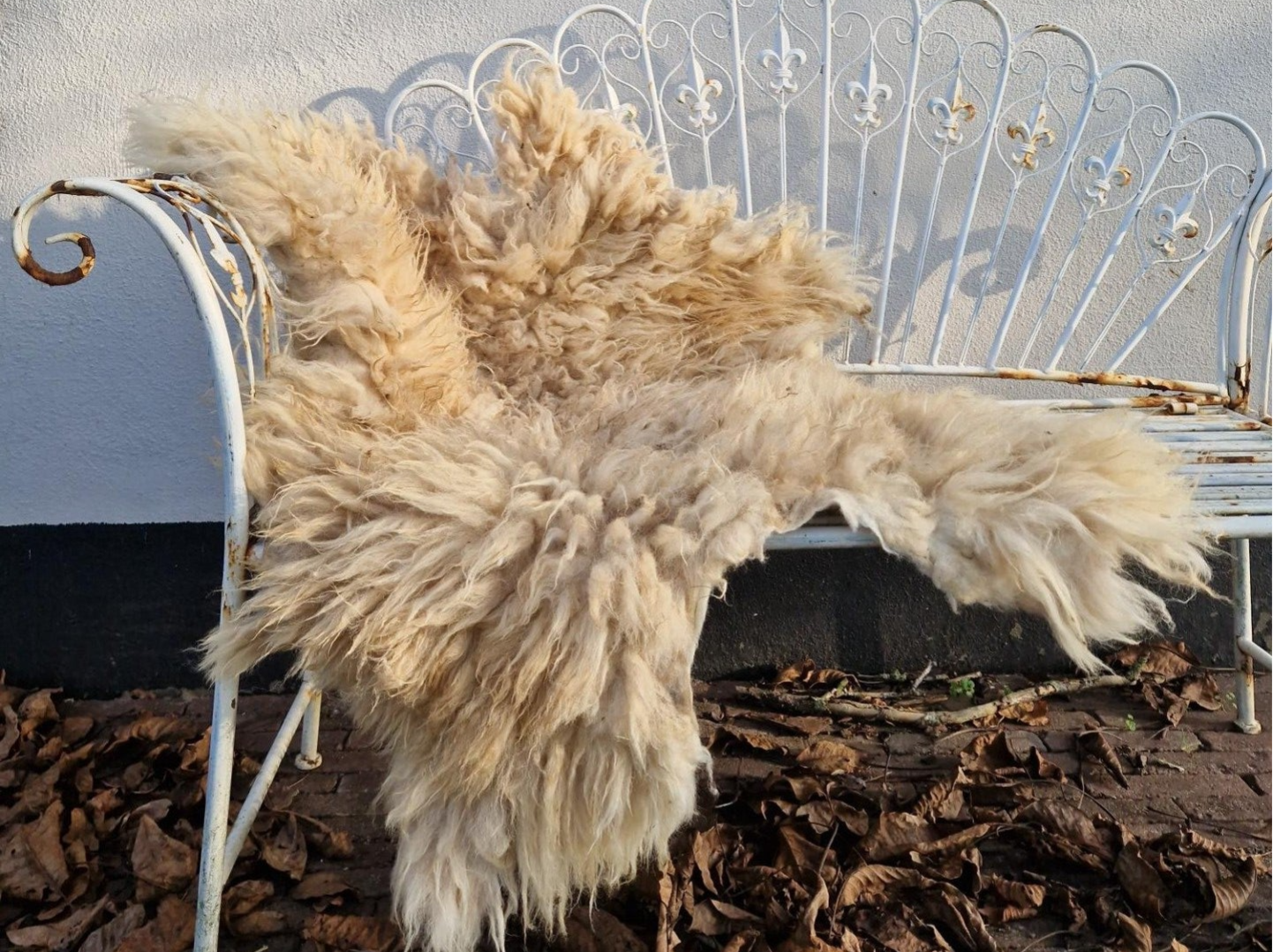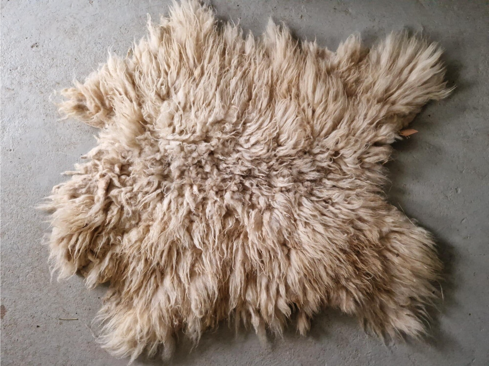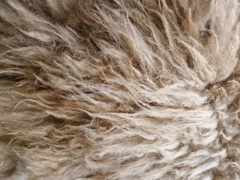 Zachte vacht in donkervos, wat 'rommelig' ogend, met kortere lokken. Er kunnen nog wat takjes in zitten die ik eventueel gemist heb. De wol komt van Geetje, een klein Schoonebeeker schaap uit Gelderland.