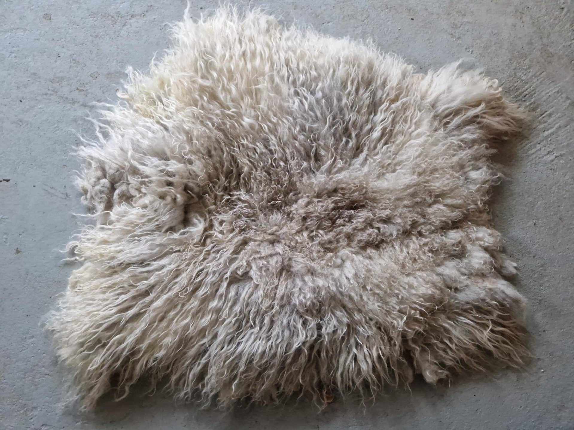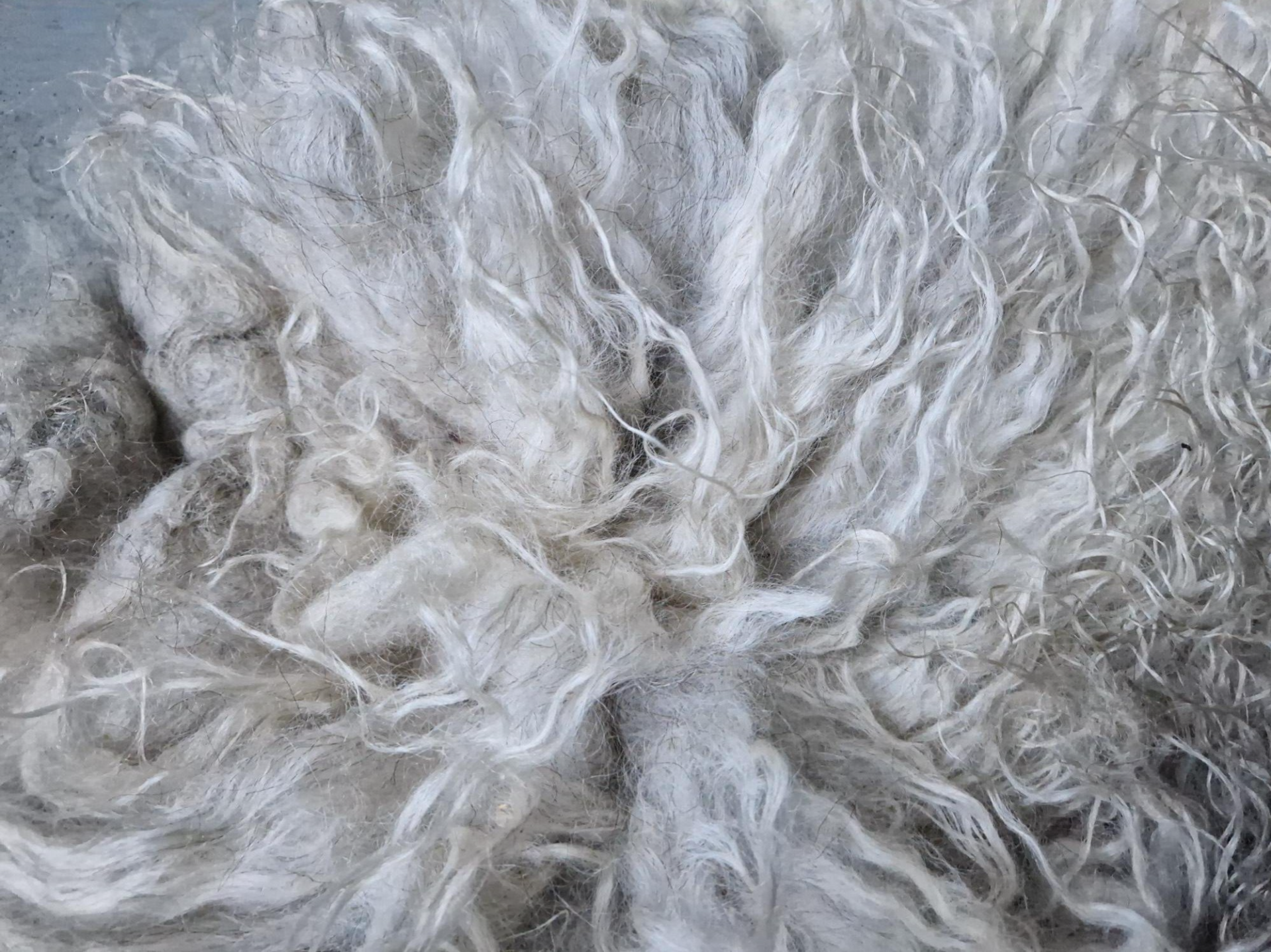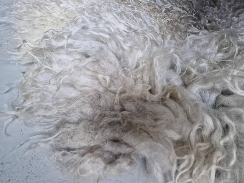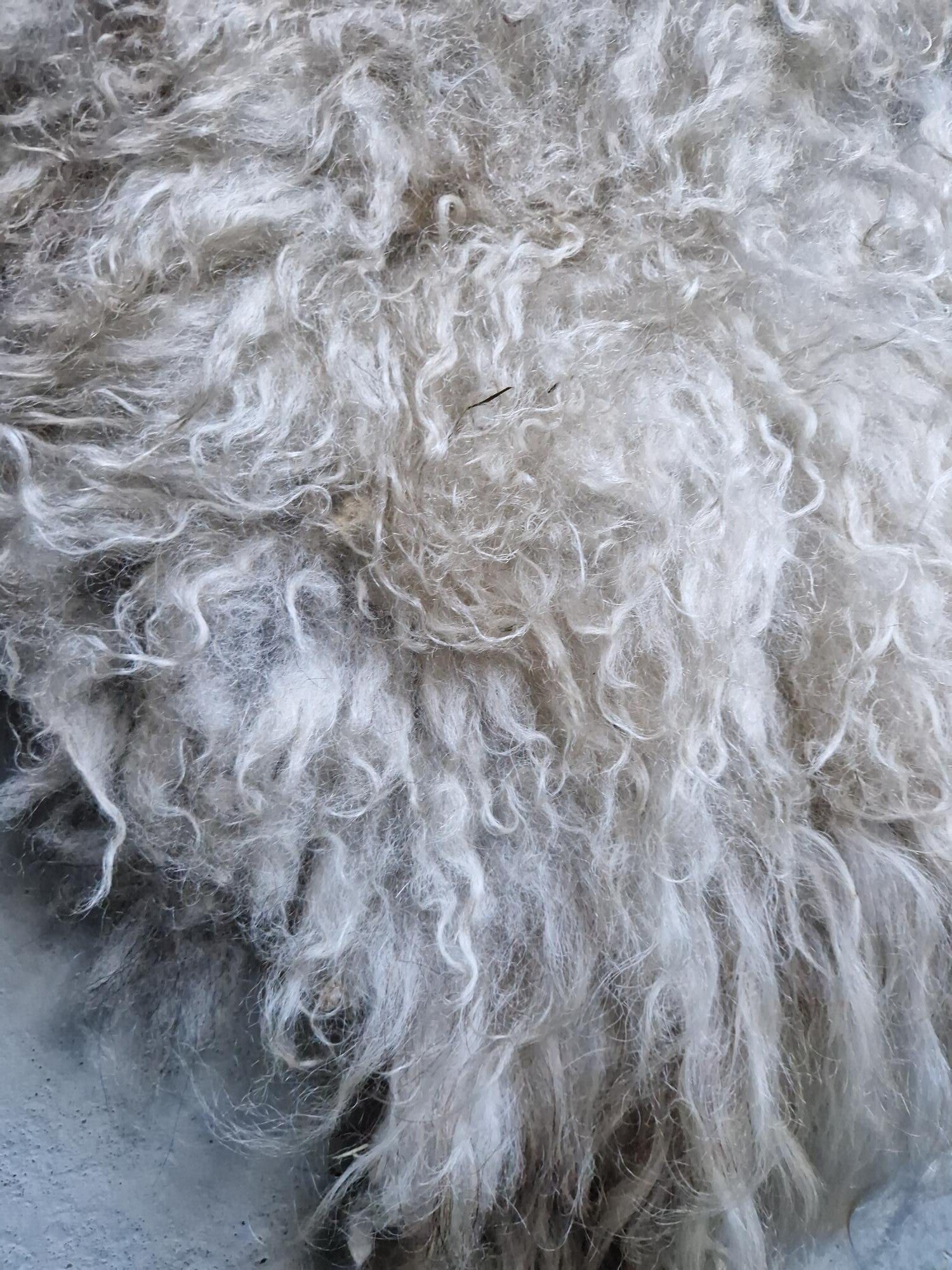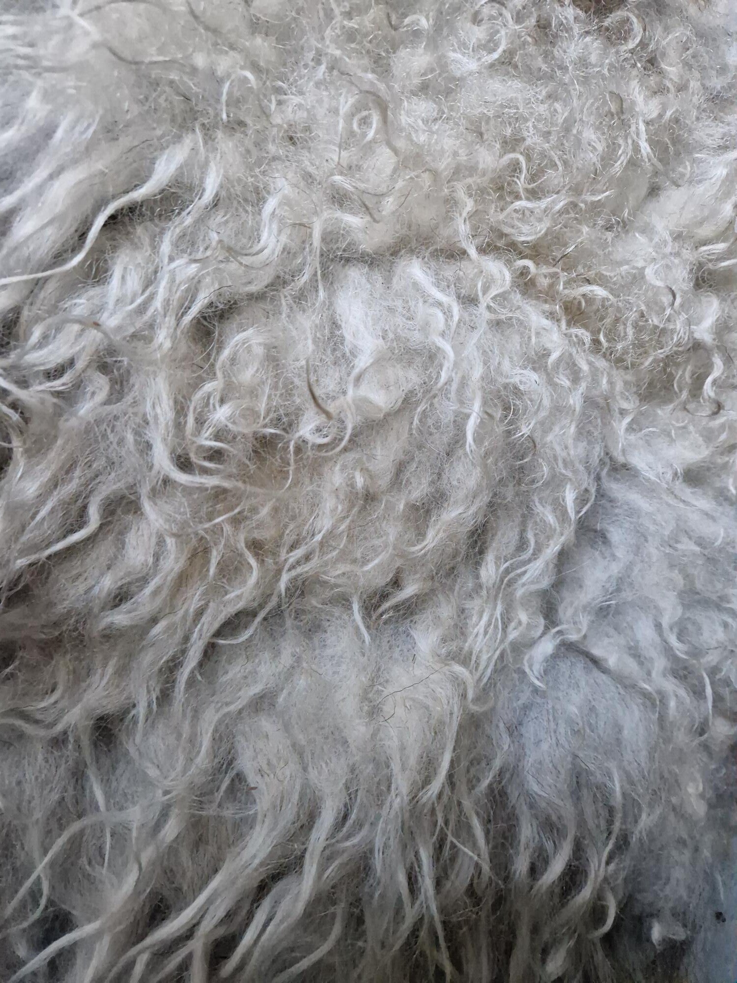 Zachte vacht in wolwit met duidelijk ook grijze haren. Bij de oksels neigend naar gelig wolwit. Heerlijk zacht en mooie, licht glanzende krullen.