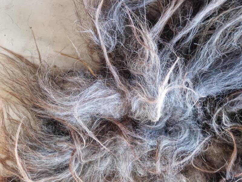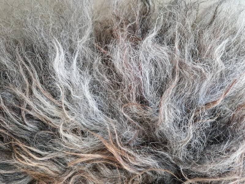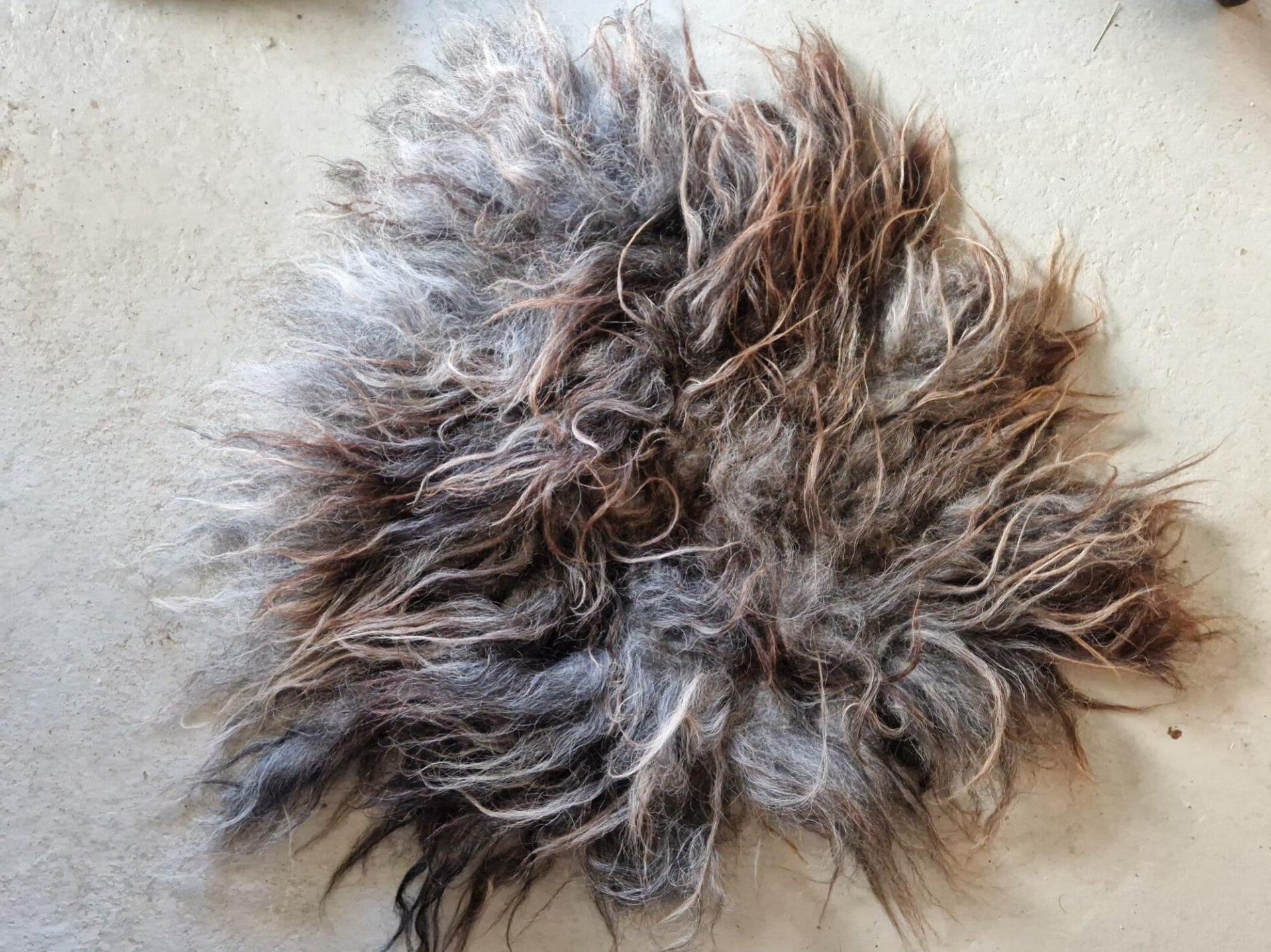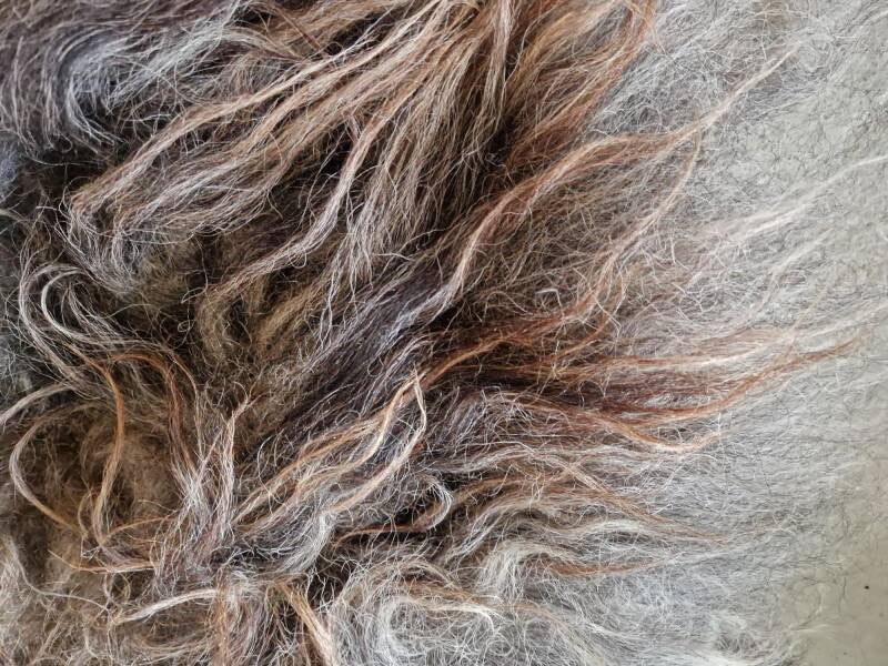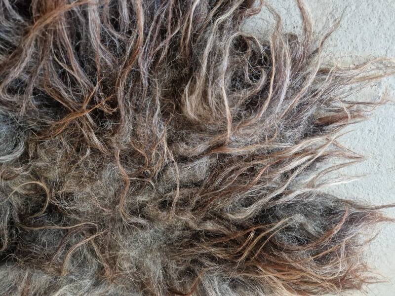 Zachte, grijze lokken met bruine punten. De wol komt van een Drents Heideschaap uit Gelderland, waar ze woont bij een hobbyhoudster. Vachtjes #959 en #960 zijn gemaakt van wol van hetzelfde schaap.