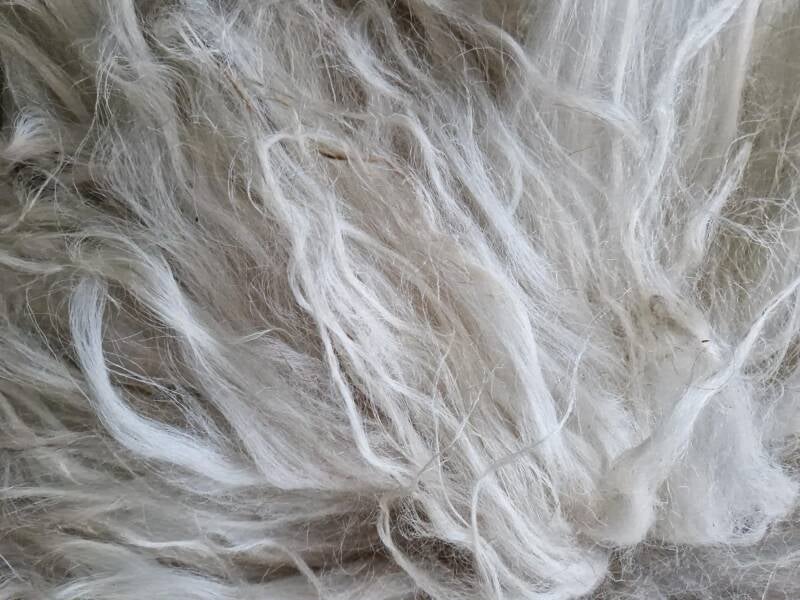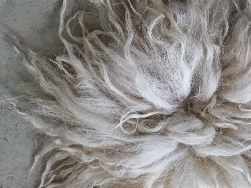 Lange, wolwitte lokken met wat vossigs in de basis.