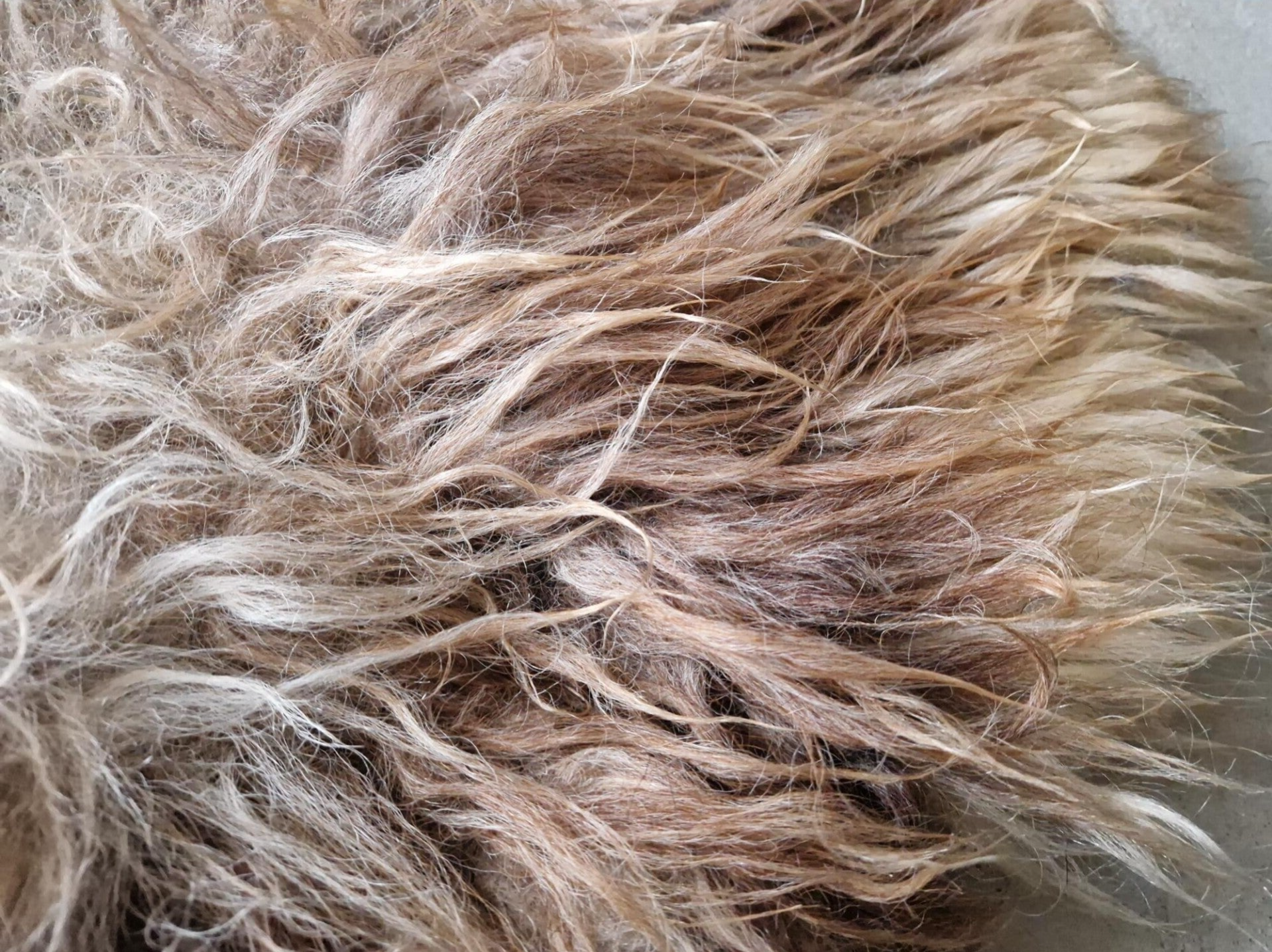 Stevige vacht die al wat natuurlijk vervilt was en daardoor dik is. De lokken zijn kort tot halflang in wolwit, beige en bruin. Het is een eerste schering van een Schoonebeeker schaap dat in Drenthe graast in een natuurgebied.