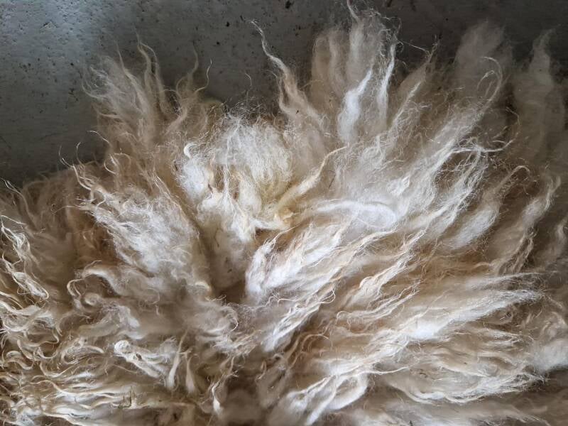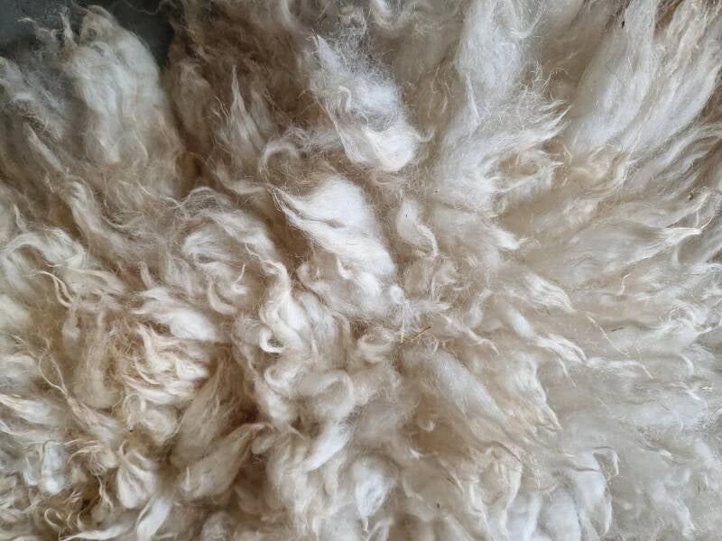 Heerlijk zachte vacht. Beetje rommelig. Wolwit met her en der wat gelig wit, maar erg fijn in gebruik en suuuuper zacht. Op de foto met de twee vachten is het de rechter vacht. De linker vacht is vacht #985.