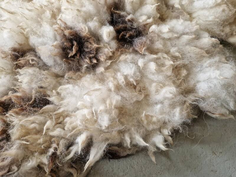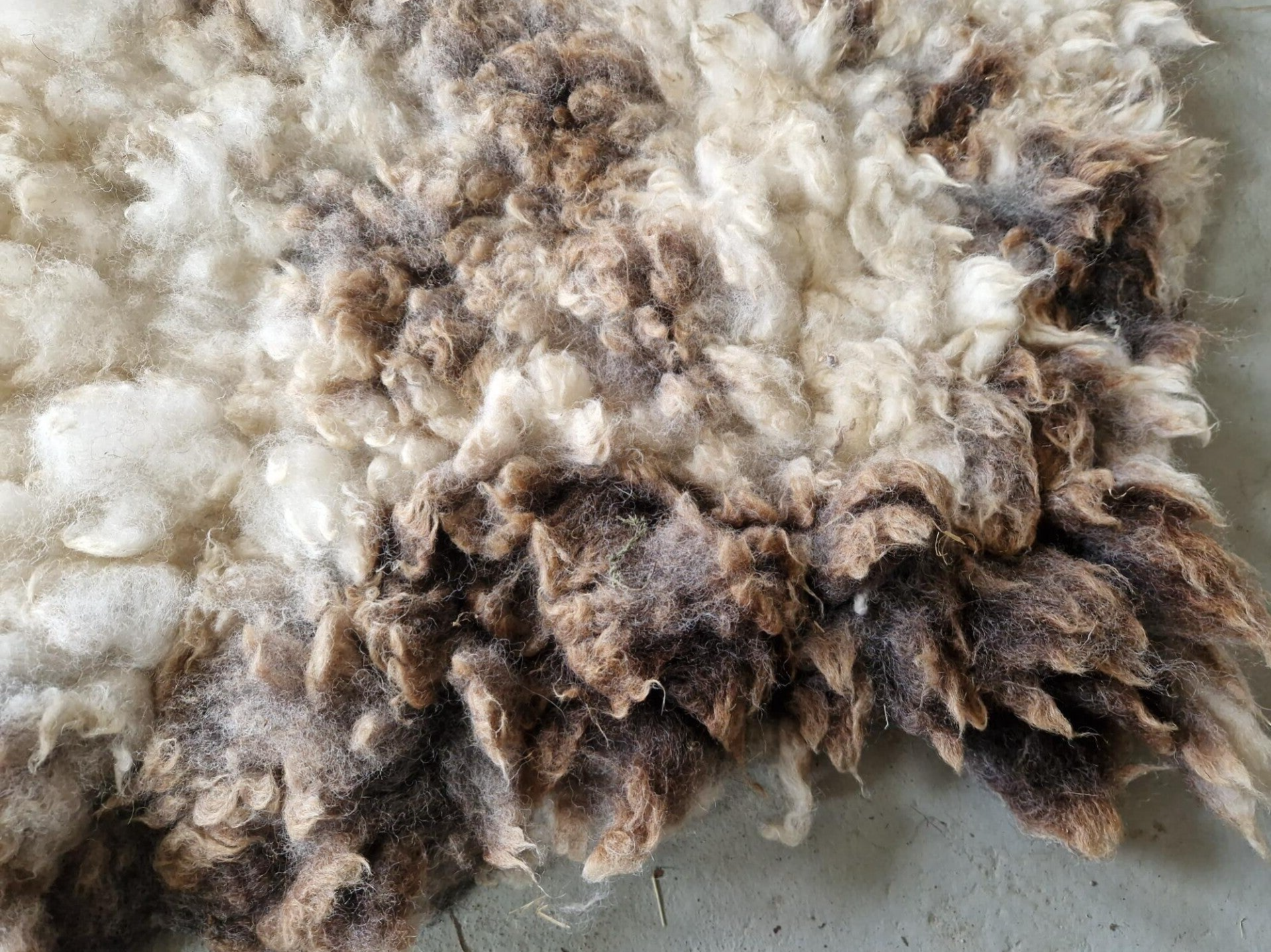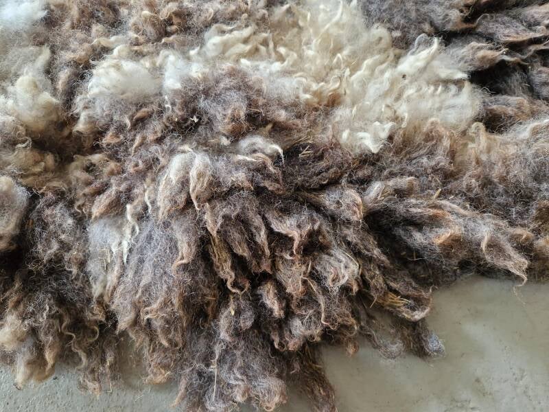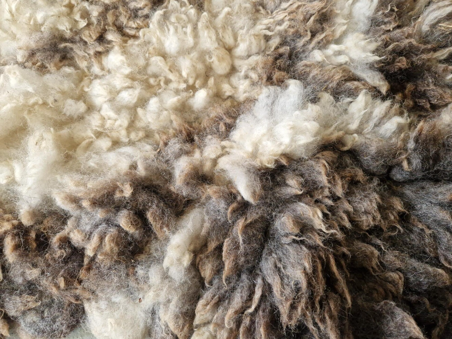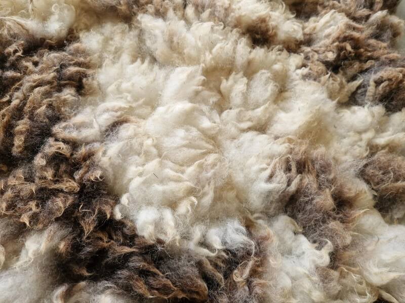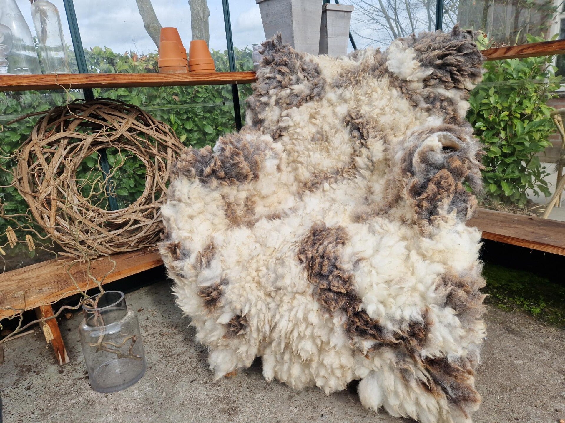 Dikke, zware vacht maar toch mooi soepel vallend. Dikke wol, lekker zacht. Wolwit met bruin en zachter bruingrijs. Er zit wat Blauwe Texelaar bloed in dit schaap, wat de grijzige ondergrond van de sommige donkere lokken verklaart. Goed te zien dat de verschillende lokken verschillende lengtes hebben, waardoor de vacht wat 'rommelig' oogt. Fijne vacht om op (of beter, in) te zitten.