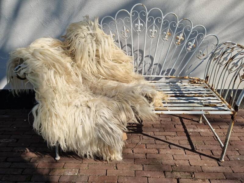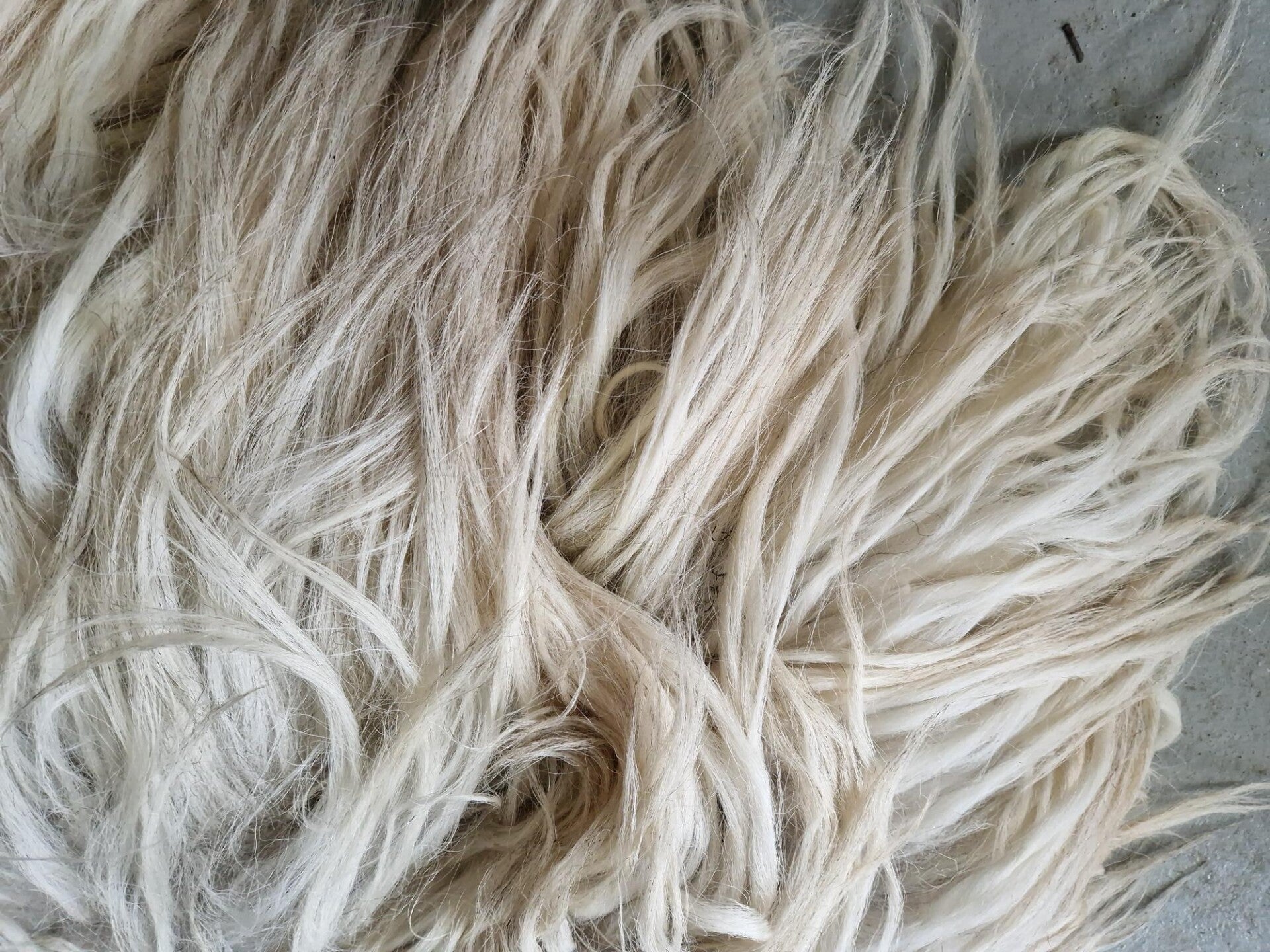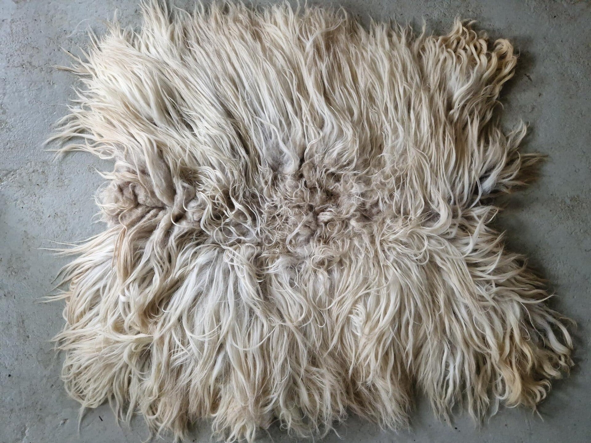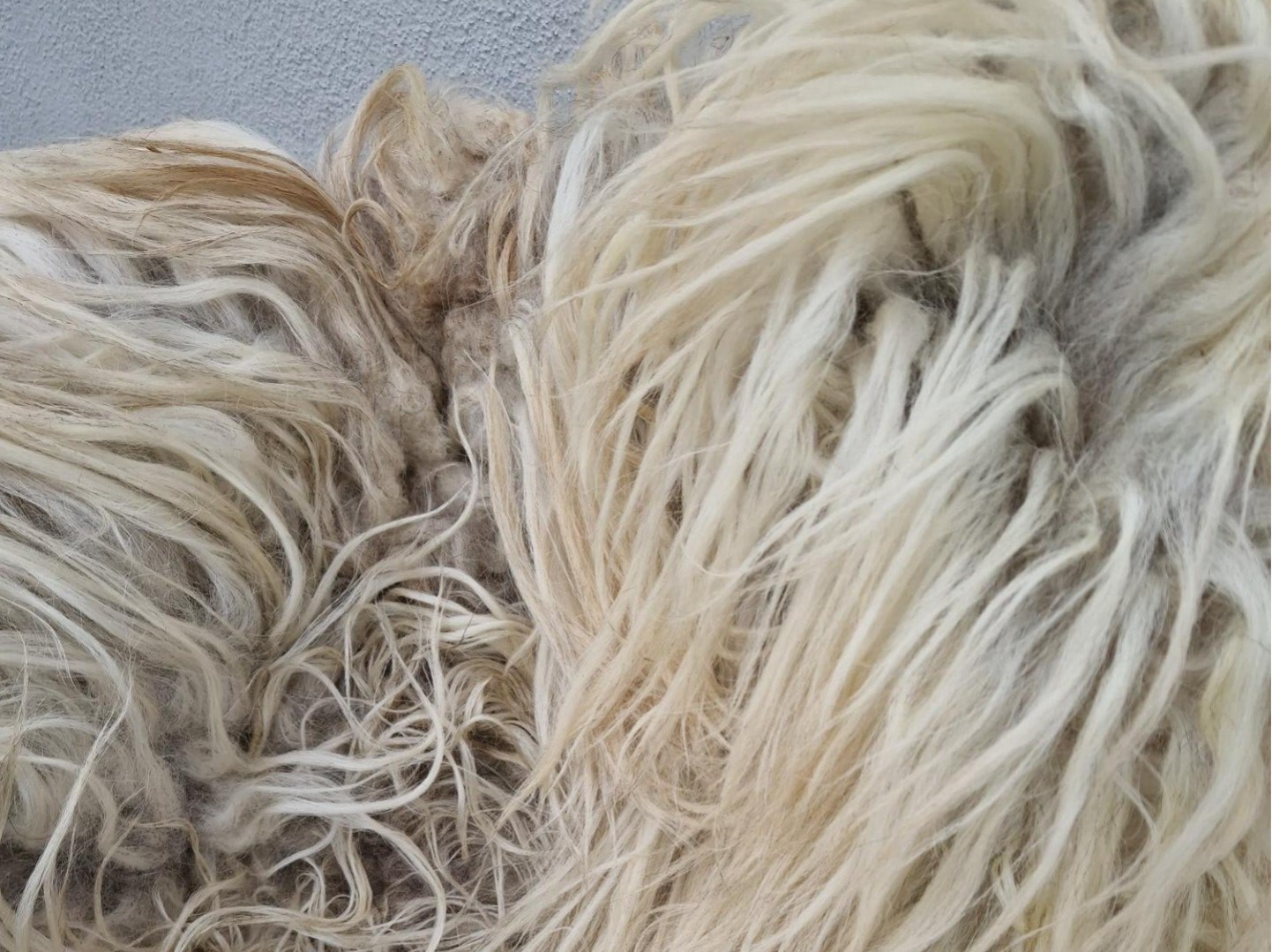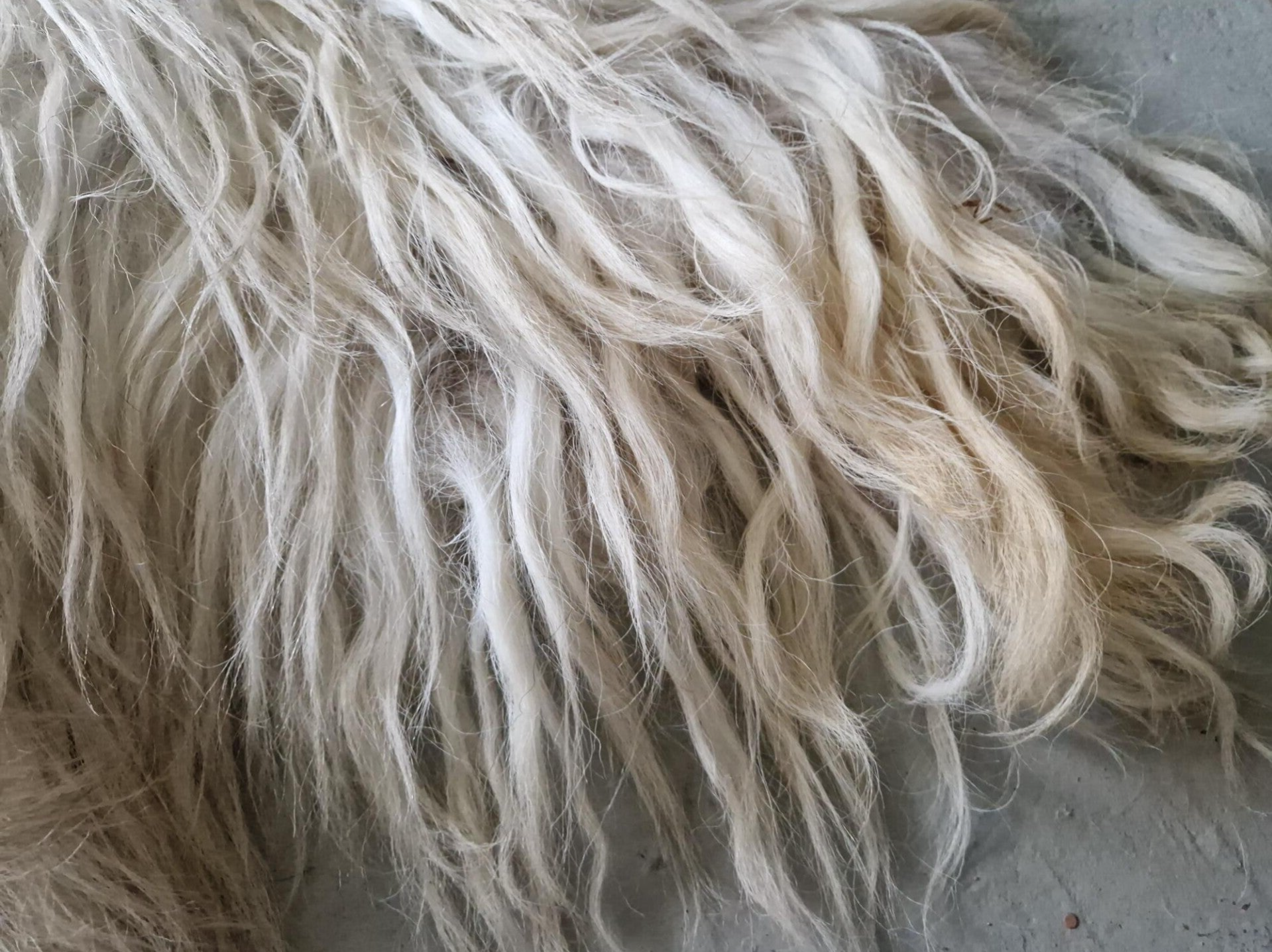 Lange, volle lokken in wolwit met een grijzige basis. Ook wat voskleur erin. In het zonlicht kleurt de vacht warm op (op de foto wel heel warm). Stevig maar toch soepel gevilt, valt mooi.
