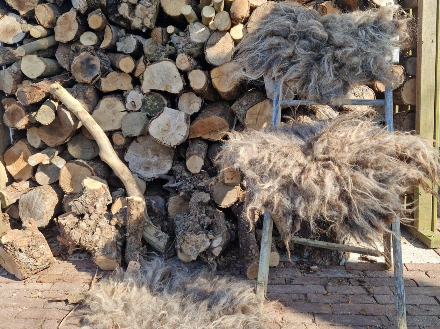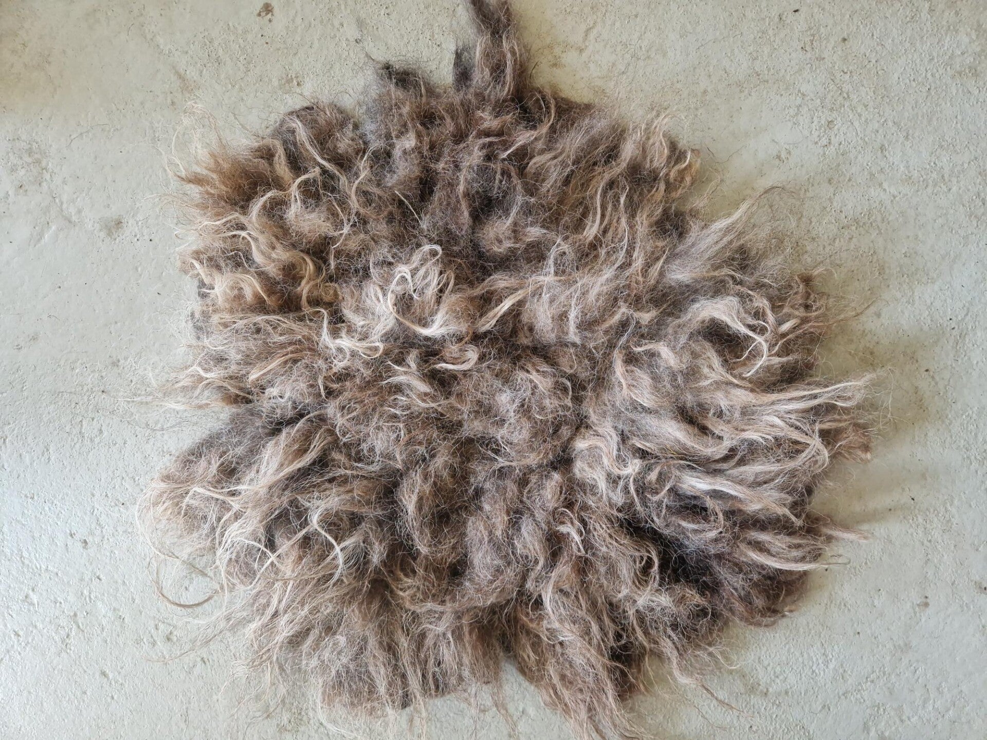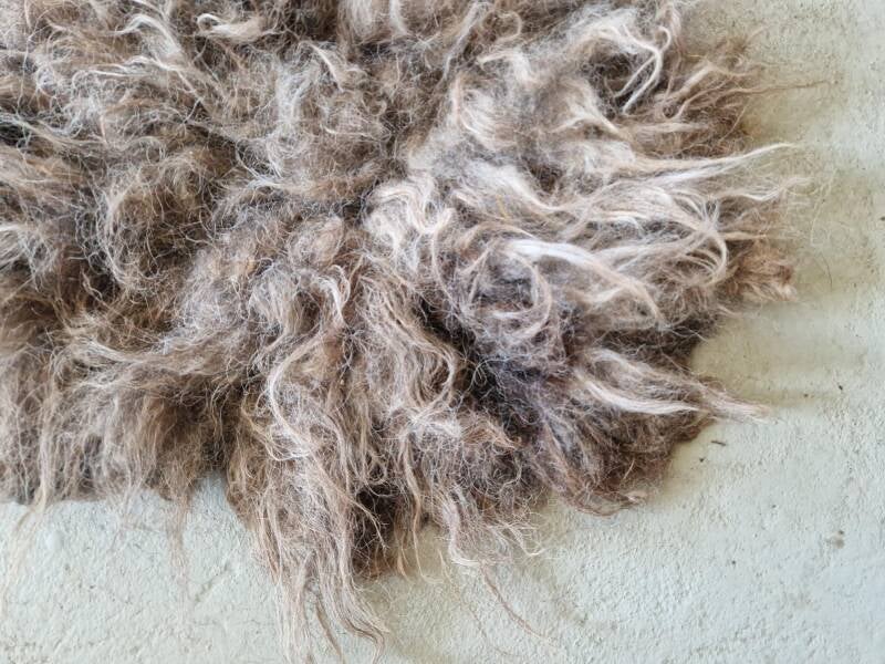 Zacht vachtje in grijs met beigebruin. In het zonlicht kleurt het vachtje wat warmer). De lokken zijn onregelmatig wat langer en korter, wat het een beetje 'shabby-chic' maakt. Precies zoals Skudde schapenwol is. Vachtjes #1011 en #1012 zijn gemaakt van wol van hetzelfde schaap.