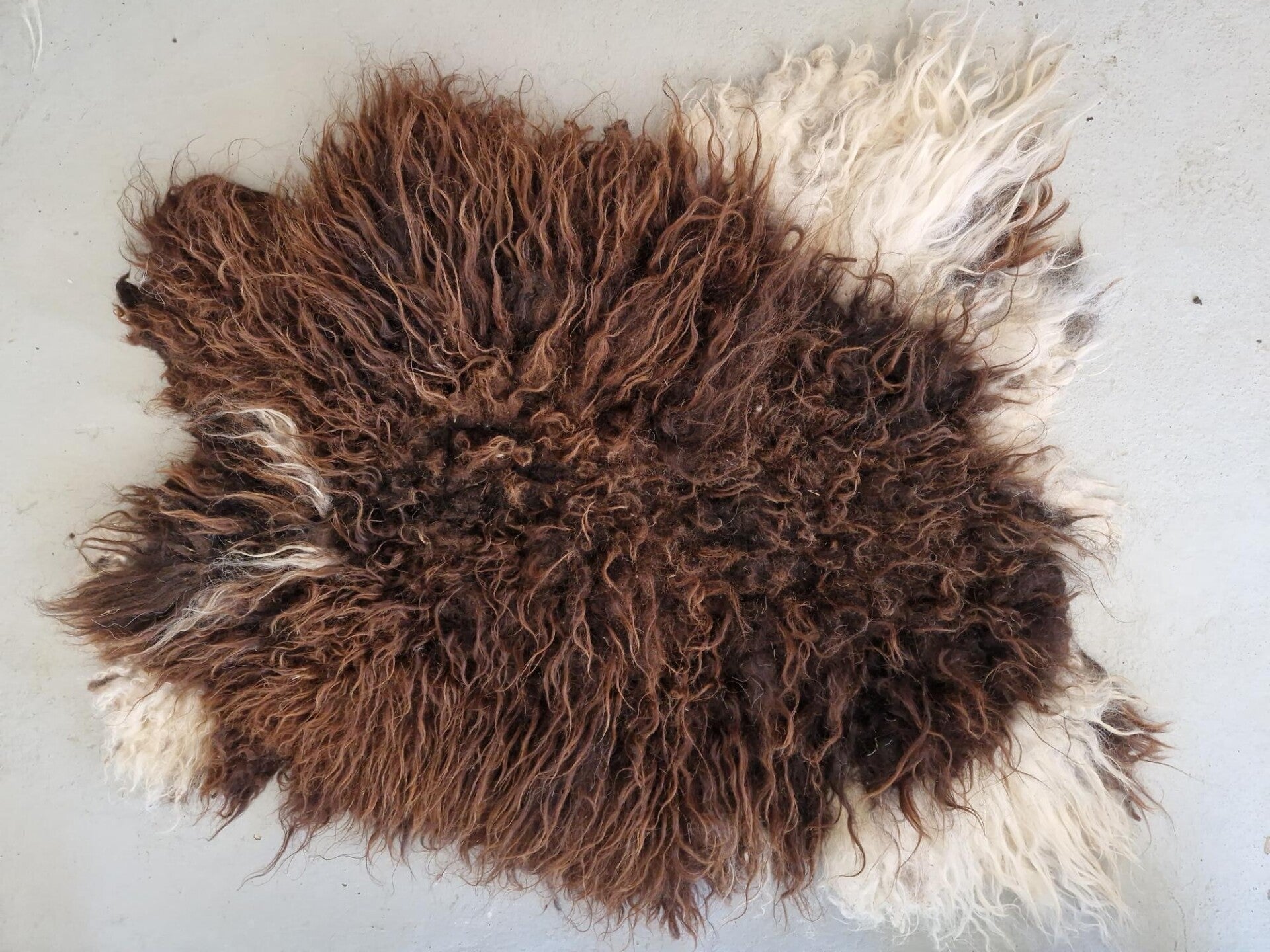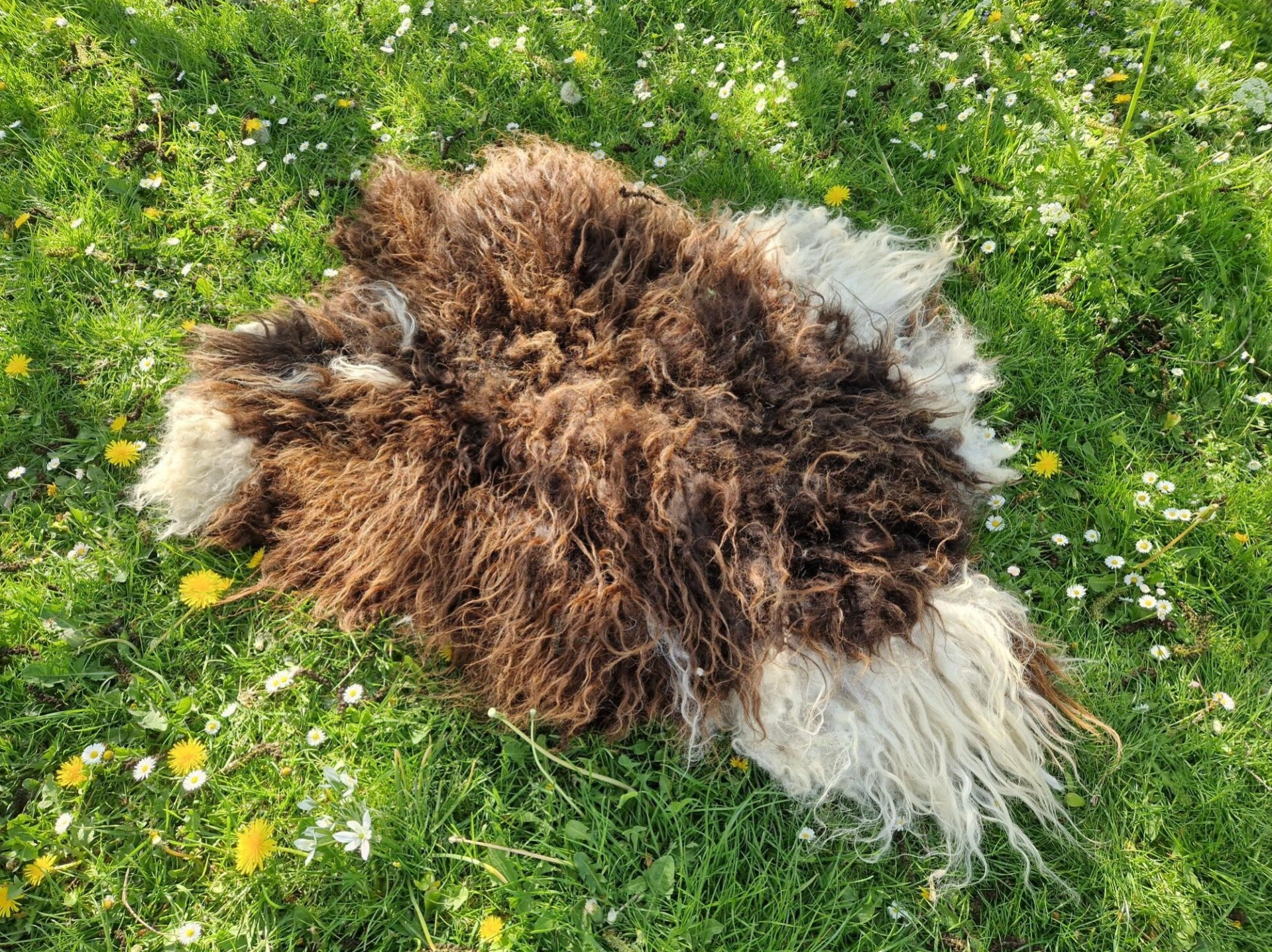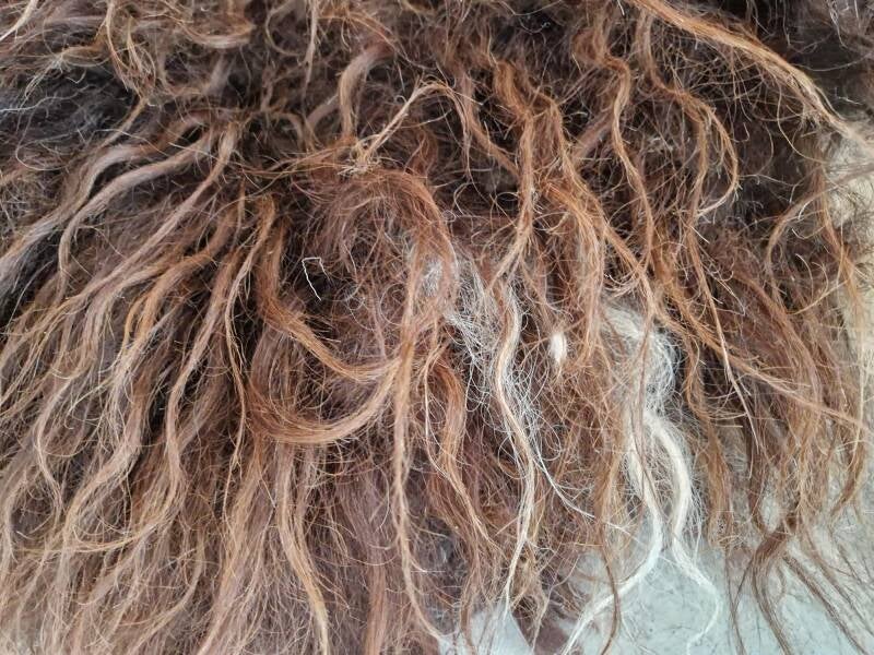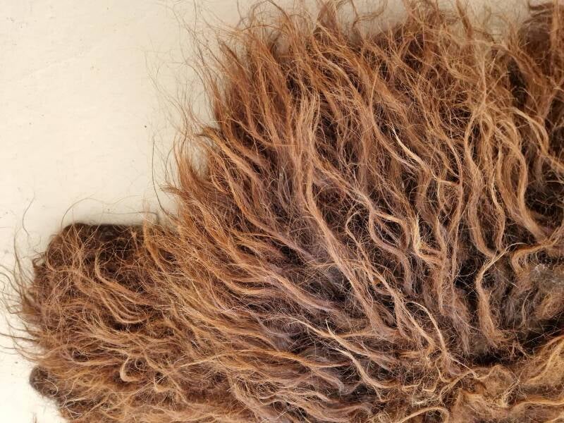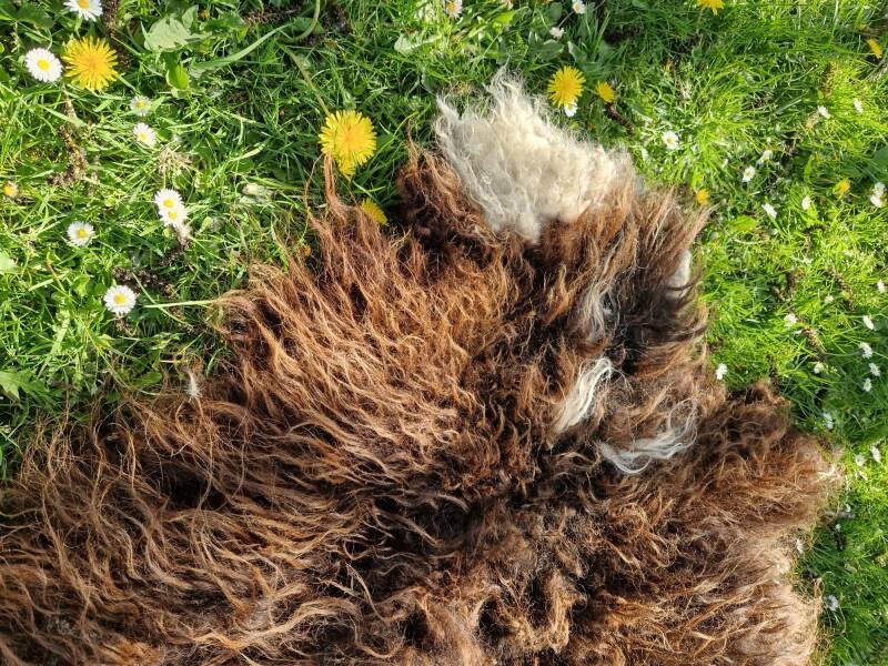 Chocoladebruine vacht met wit bij de poten. Het rugstuk is bijna zwart in de basis en omdat de vacht daar wat minder vol is, is dit duidelijk te zien (zie ook de foto's). Er zitten in het rugstuk nog wat resten van natuurlijke flora, maar dat mag de pret niet drukken. Het schaap loopt op de heide en het rugstuk heeft duidelijk meer te verduren gehad dan de rest van de vacht. De wol is wat 'ruwiger' voelend dan de meeste Drents Heideschaap wol, wat het vachtje stoer maakt.