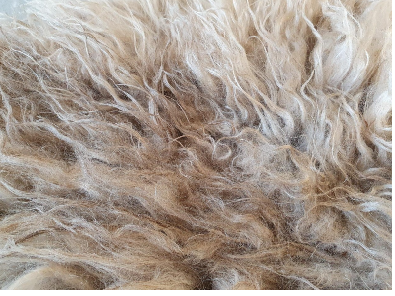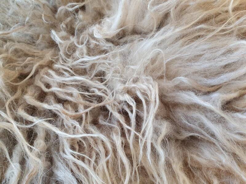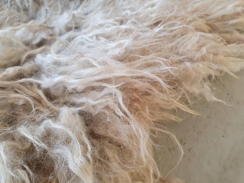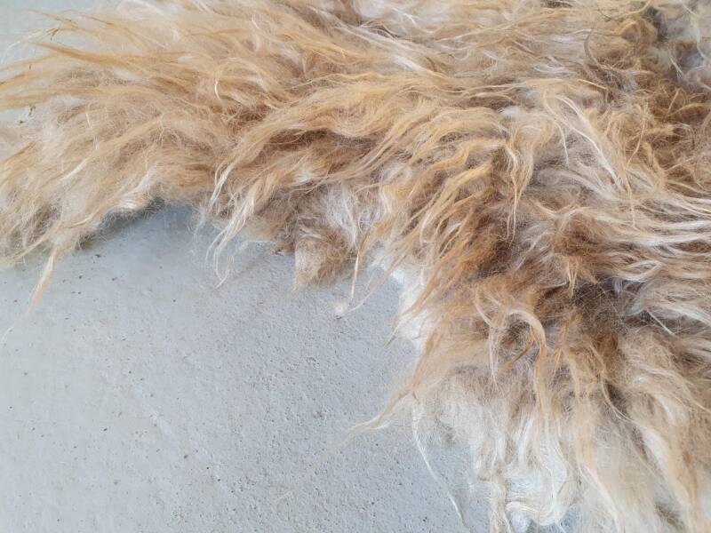 Een wat ruiger vachtje van een lammetje. Eerste schering. De halflange lokken zijn dik en her en der al wat vervilt, wat de ruigheid geeft. Een stukje kaal (laatste foto) maar dat valt niet op. Wolwit van kleur, met wat grijs in de basis. Licht wat roestkleur en het rugstuk neigt naar wat beige achtig, in ieder gevalt iets donkerder.