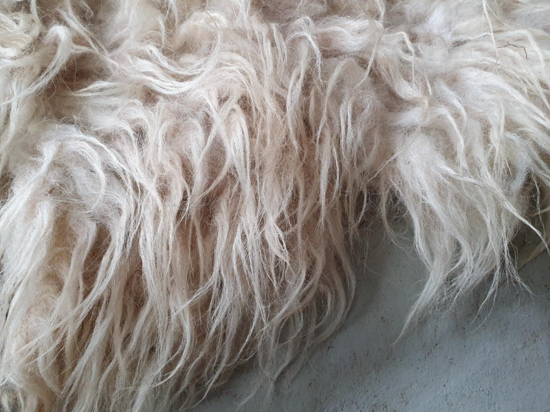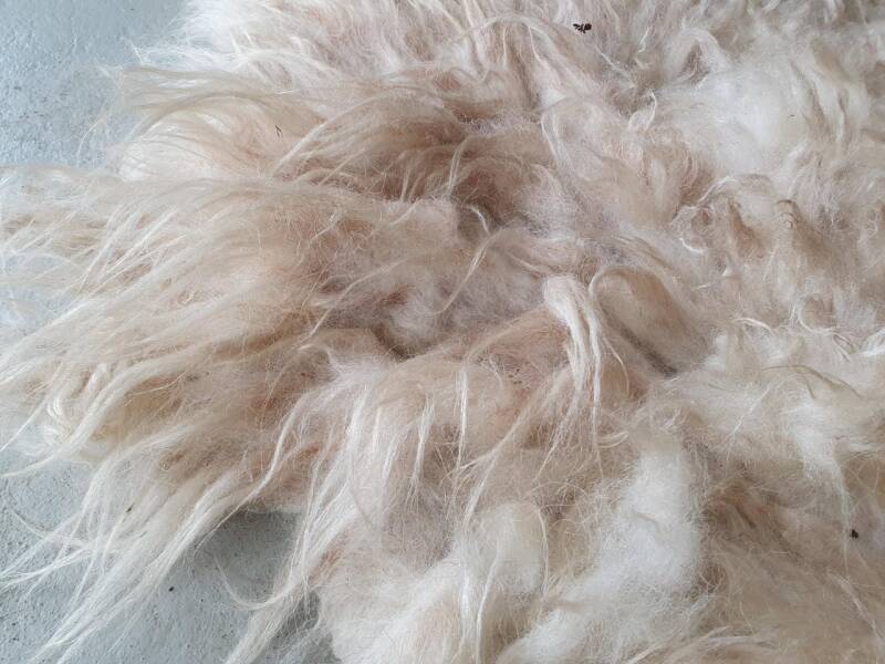 Een kleinere Schoonebeeker vacht. Rommelig met langere lokken en plattere, kortere door elkaar heen. De basis van de lokken is her en der wat donkerder, de lokken zijn licht. Een echt gebruiksvachtje. Niet mooi an sich, maar zo kwam de wol van het schaap af. Heeft flink liggen schuren denk ik. Vandaar de lagere prijs. Goed te gebruiken om dagelijks op te gaan zitten, of bijvoorbeeld in de hondenmand.