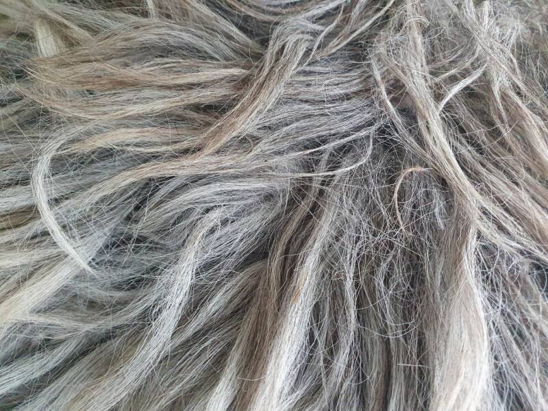 Een Heidschnucke vacht. Lange lokken. Grijs in de basis. De lokken zijn lichtgrijs, donkergrijs, met wat blond en beige erdoorheen.